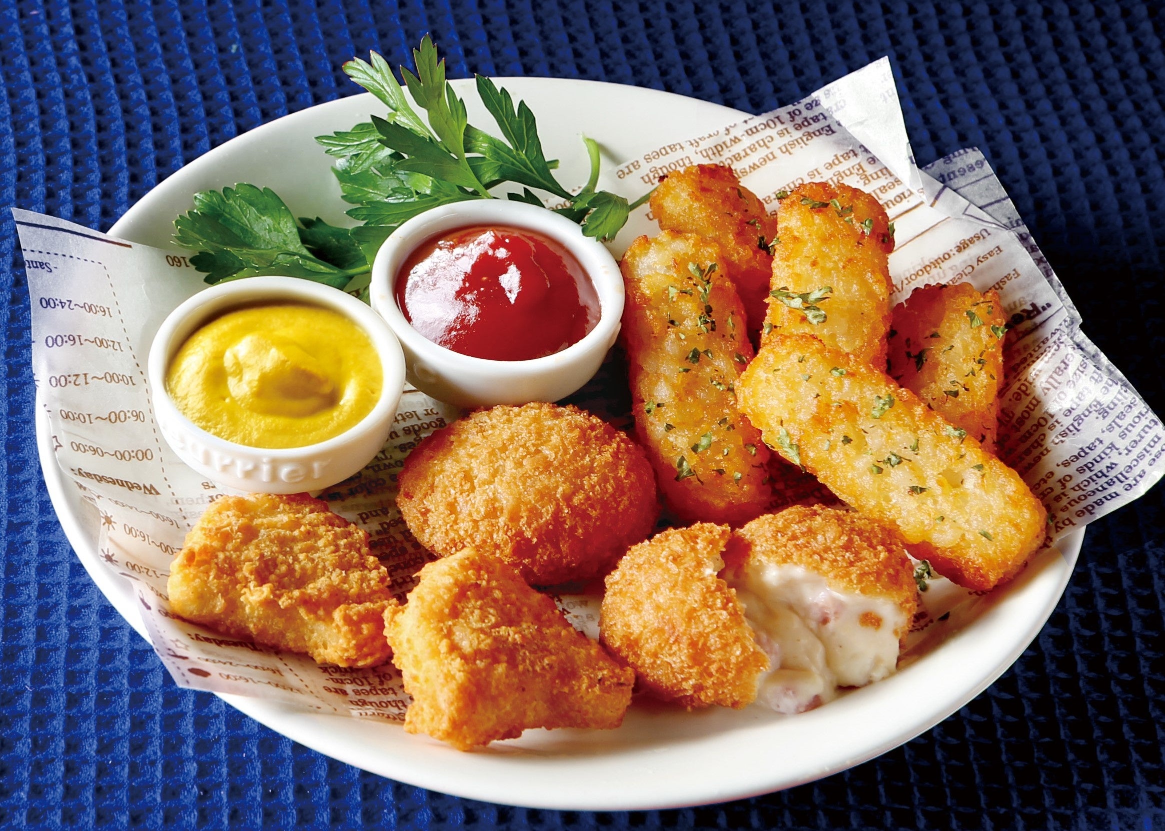 『トリプルミックス』は、人気のポテト・ナゲットと、オリジナルのクリームコロッケを組み合わせた、ピザのお供に嬉しい組み合わせです。クリームコロッケは新しく「熟成ベーコンのクリームコロッケ」にリニューアル。なめらかなクリームの中に、熟成ベーコンの旨みと北海道産玉ねぎの甘みが広がるクリームコロッケです。