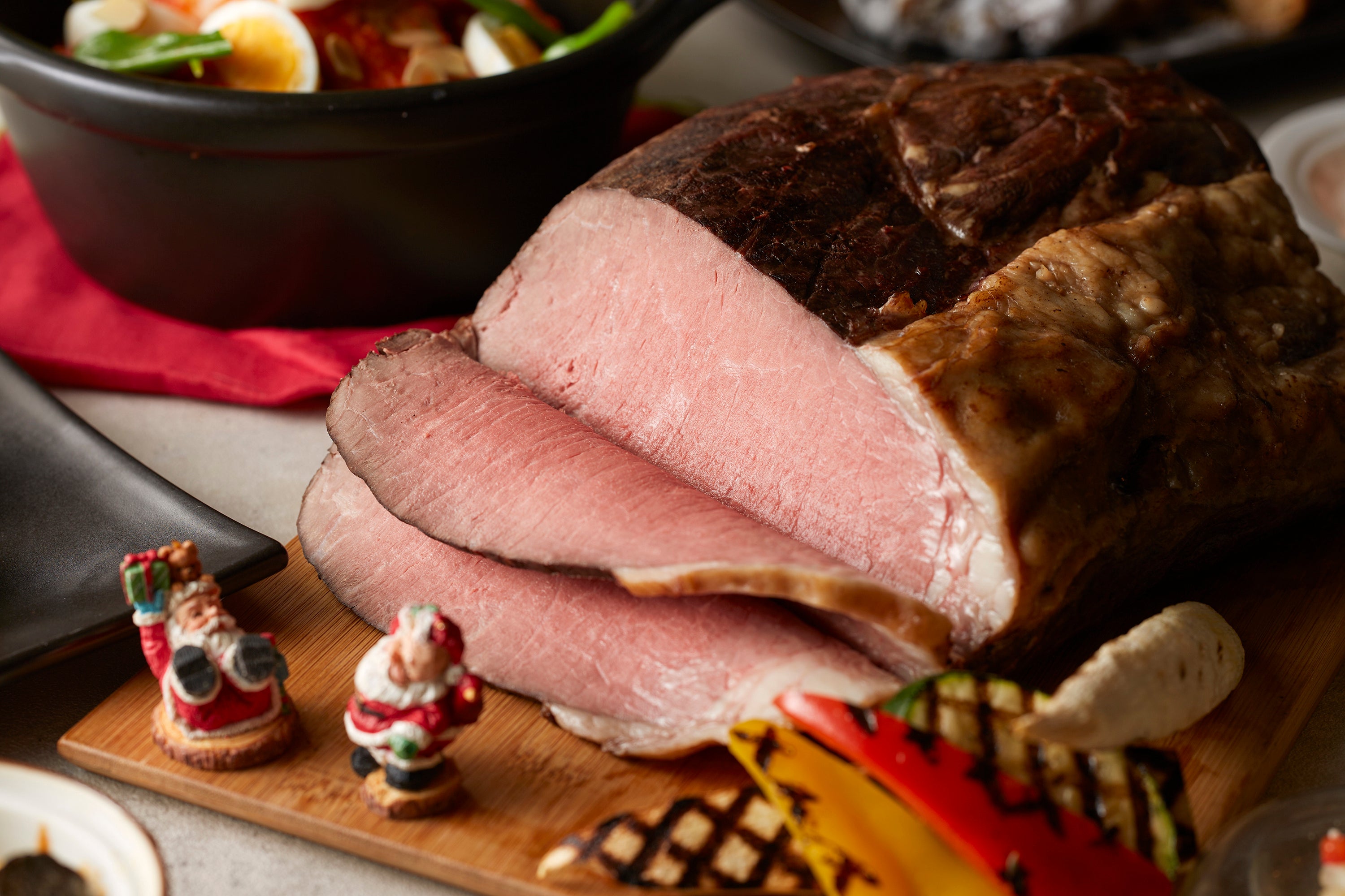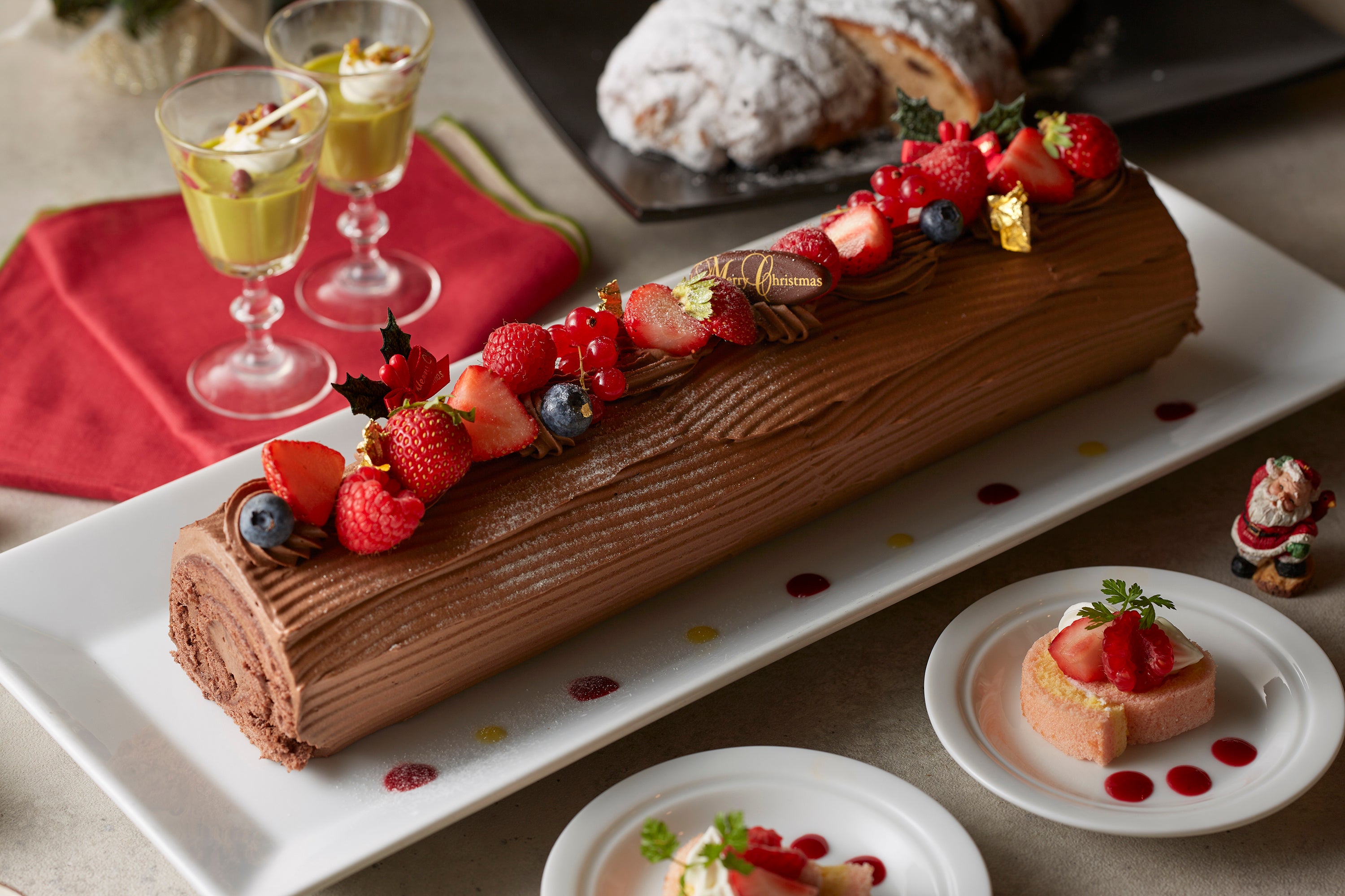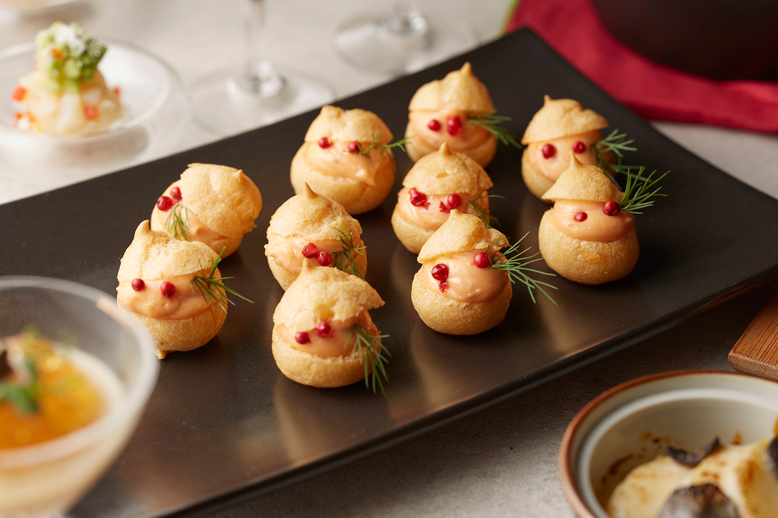 ディナー限定でご提供する、口どけが良く柔らかい「和牛のローストビーフ」は、シェフがお客様の目の前でカットし取り分け、フレッシュな香りと上品な刺激の柚子胡椒を利かせた赤ワインソースとともに召し上がりいただきます。低温調理で火入れをしたジューシーな「鴨もも肉のグリル」は、ブルーベリーやフランボワーズが入った鮮やかな4種類のベリーソースと相性が抜群です。クリスマス気分を盛り上げる「牛頬肉の赤ワイン煮パイ包み」や、「スモークサーモンとクリームチーズのシュー」にはピンクペッパーとディルでクリスマスカラーの赤と緑をあしらうなど、見た目もお楽しみいただけるメニューも取り揃えました。