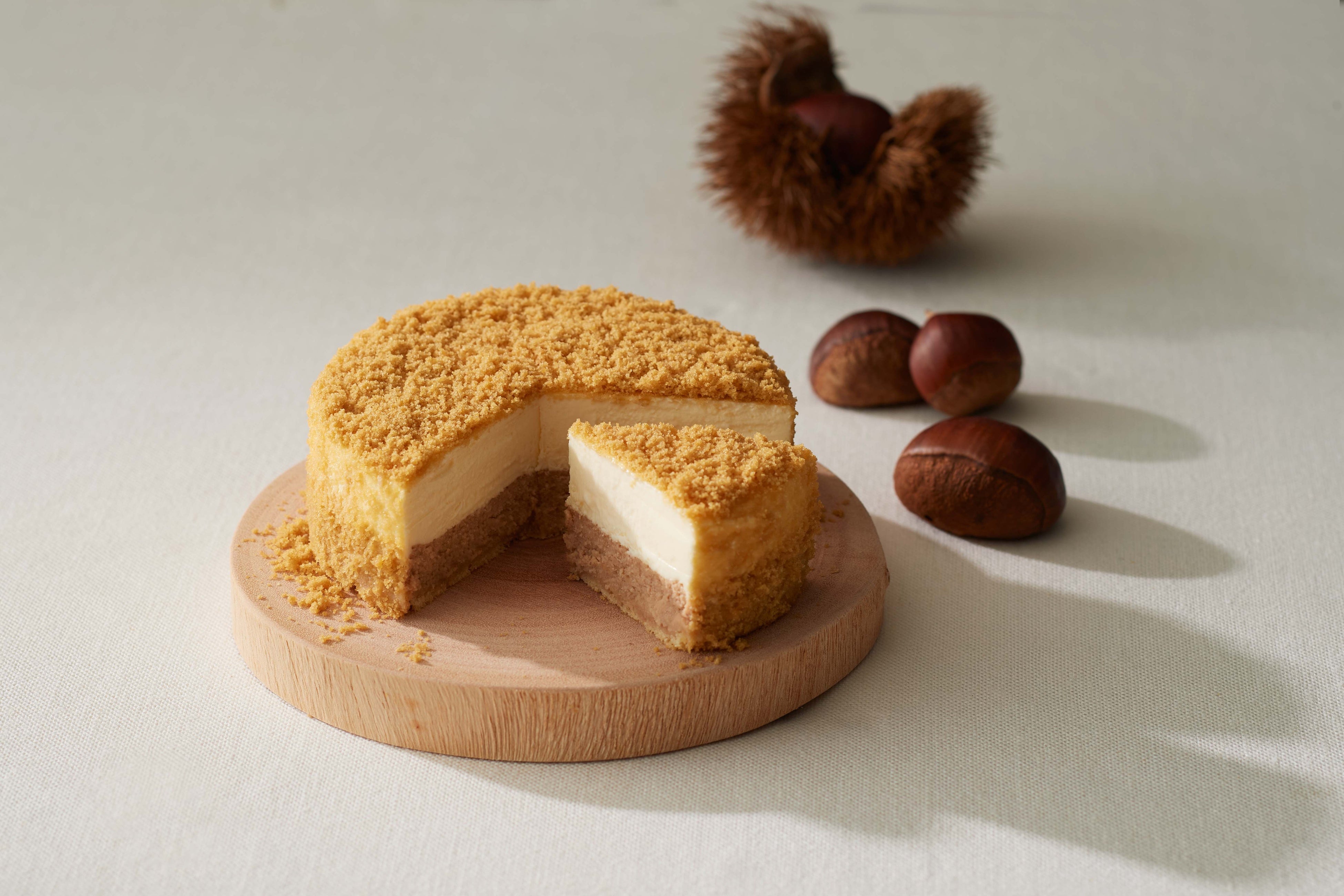 あっさりとした味わいのイタリア産マスカルポーネムースに、コクのあるイタリア産マロンペーストとオーストラリア産クリームチーズで焼き上げたベイクドチーズを重ねました。