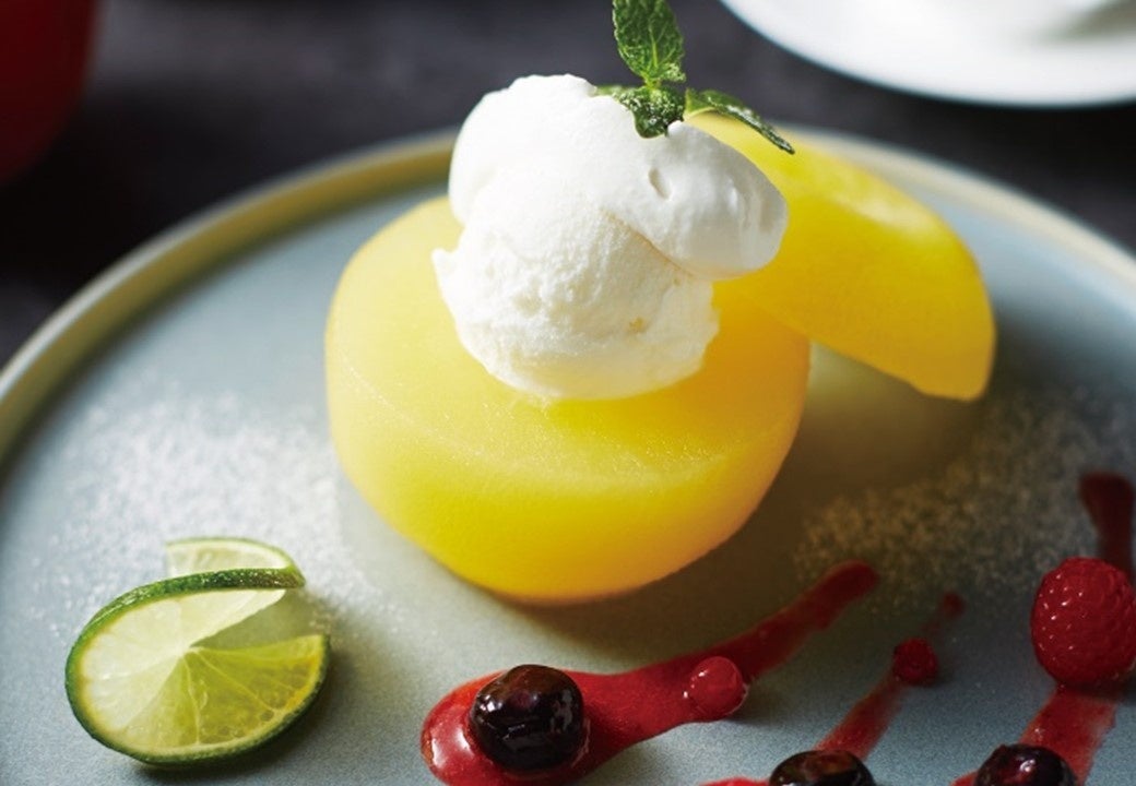 さっぱりとしたシロップにりんごを丸ごと漬け込んだコンポートとヨーグルトアイスの爽やかな風味のデザート仕立て。ミックスベリーソースとマイヤーレモンを添えて。