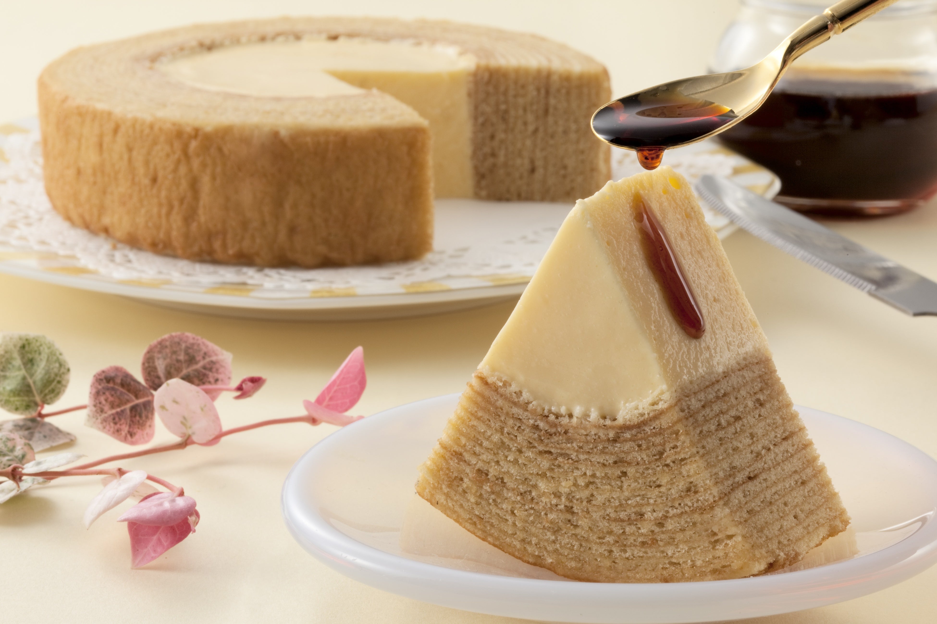 やわらかなメープル風味が香るバームクーヘンの生地の中に、オリジナルのプリンをていねいに流し込みました。メープル風味のふわふわバームクーヘンと口の中でとろけるプリンが一度に味わえます。