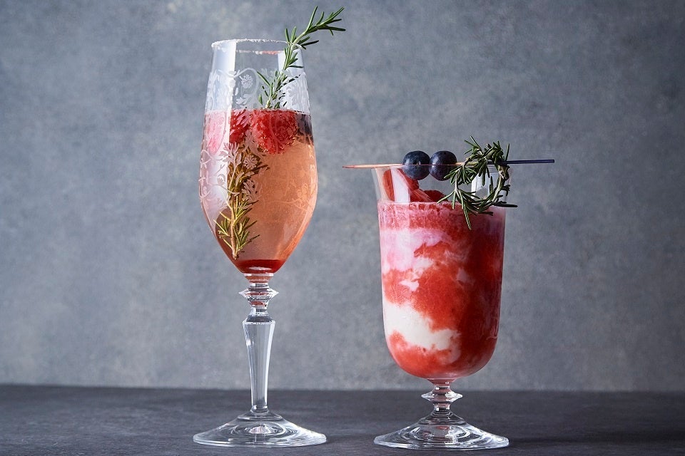 クリスマスに合わせて登場したカクテルは、まるで宝飾品のように美しい仕上がりに。クリスマスツリーをイメージして創られたシャンパンカクテルと擂り潰した苺をホワイトチョコレートのリキュールとラムで仕上げた甘露な一杯が、ディナー前後のお時間を華やかに演出します。