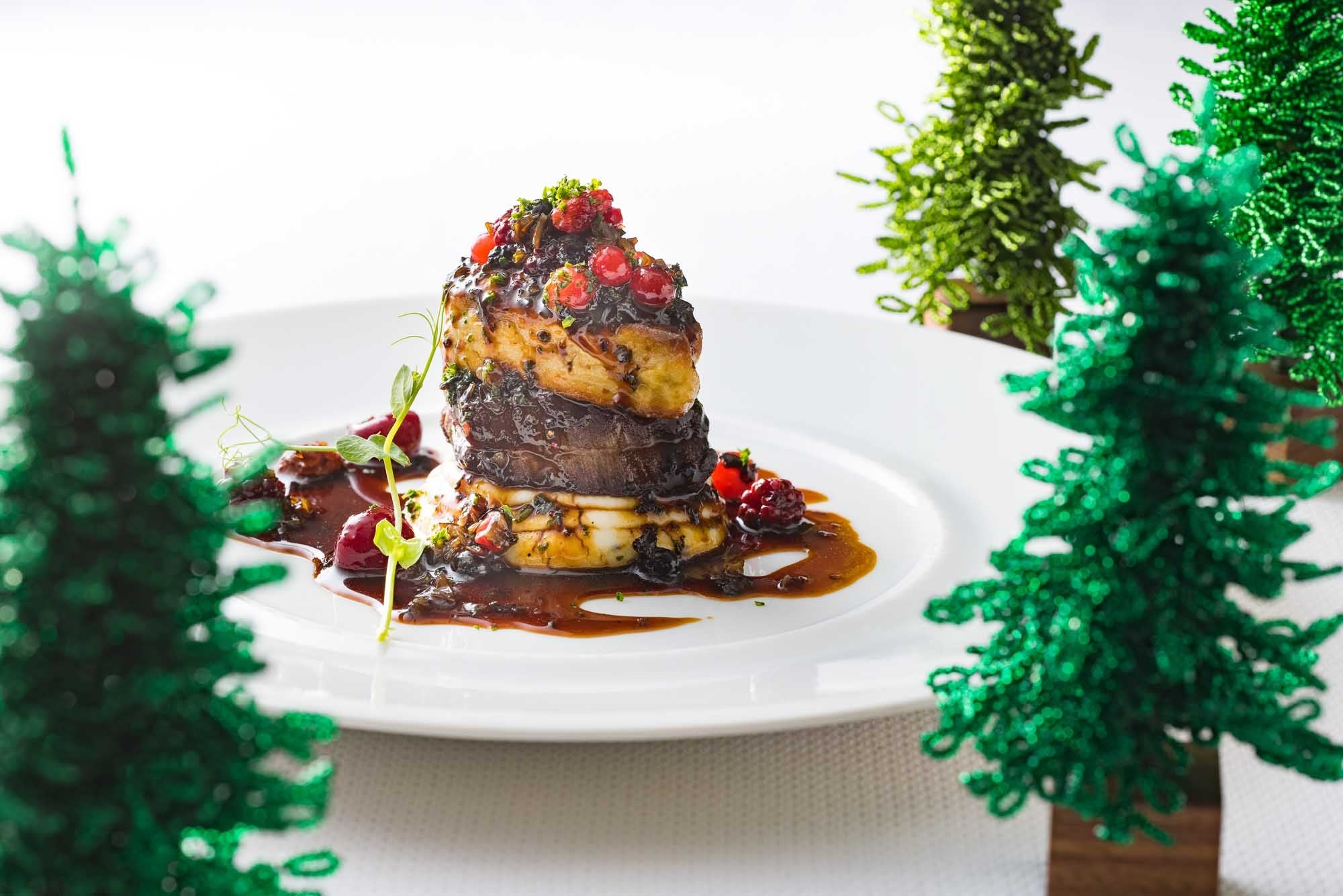 プリフィックススタイルのクリスマスディナーもご用意しております。数あるセレクトの中でもおすすめは、国産牛フィレに芳醇なフォアグラ&トリュフを掛け合わせた一皿。クリスマスツリーのような佇まいはテーブルの雰囲気を盛り上げます。
