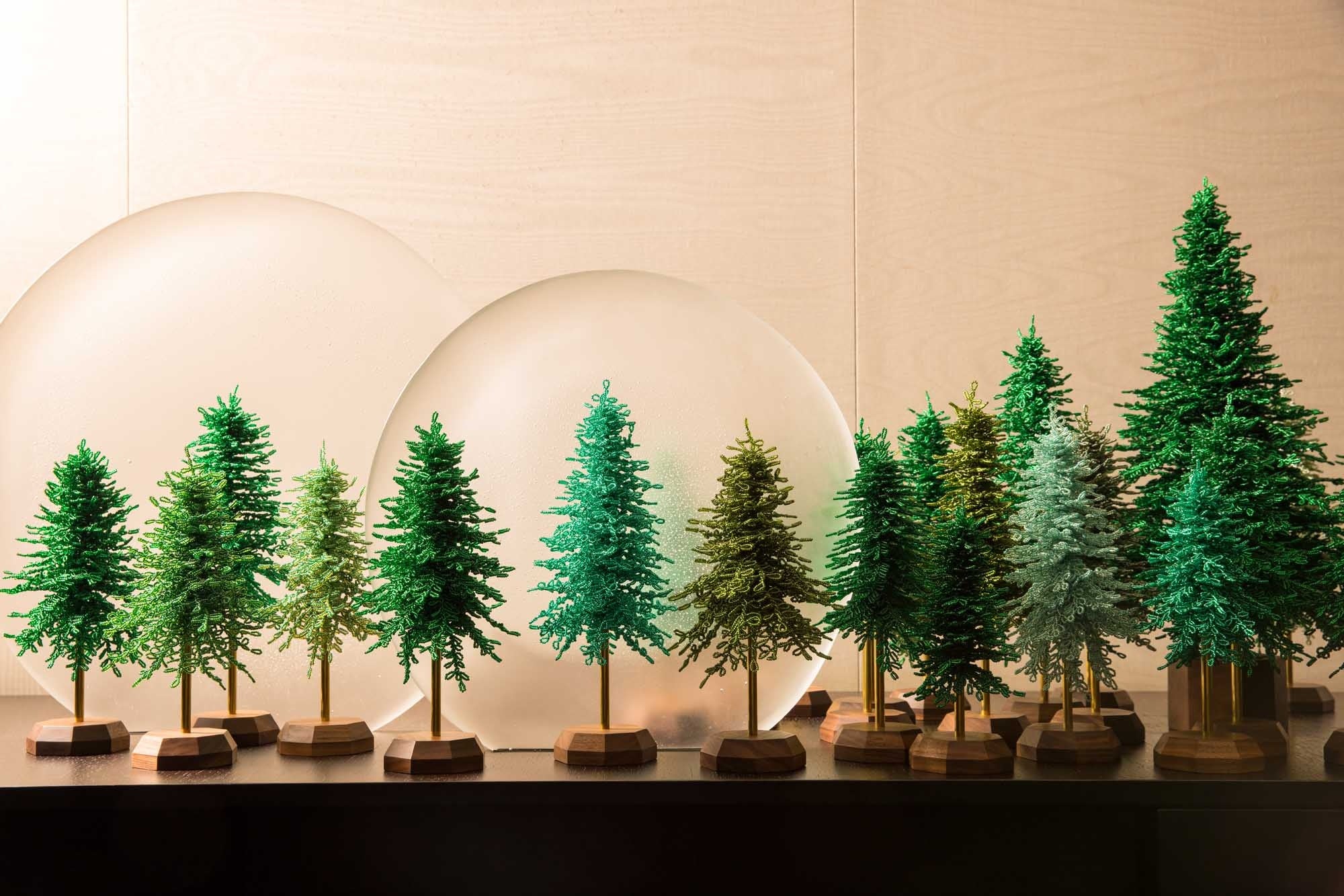昨年ご好評いただいたビーズツリーと新作のスワッグ(壁飾り)は、全て手作業で創りあげたもので、使用した直径2㎜のグラスビーズの数は合計で150万個以上に及びます。自然の木、花の形や大きさがそれぞれ違うように一本ずつ色や葉の付き方が異なる個性豊かなビーズツリーを集め、杜を表現しています。また、この杜のなかに潜む雪のように白いツリーには、地球温暖化の影響で降雪が減少した地域に、もう一度雪が降るよう願いを込めております。なお、ビーズツリーの土台は木製工芸品の製造時に生じた高品質な廃材をアップサイクリングしたものでSDGs貢献に結びついています。