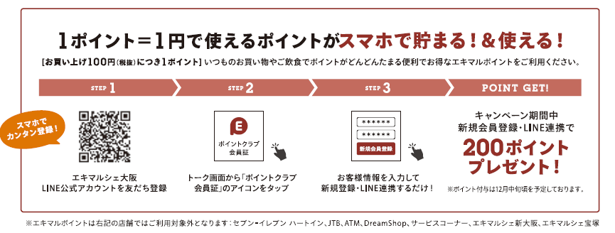 (1)エキマルポイントクラブ新規会員登録及びLINE連携で200Pプレゼント