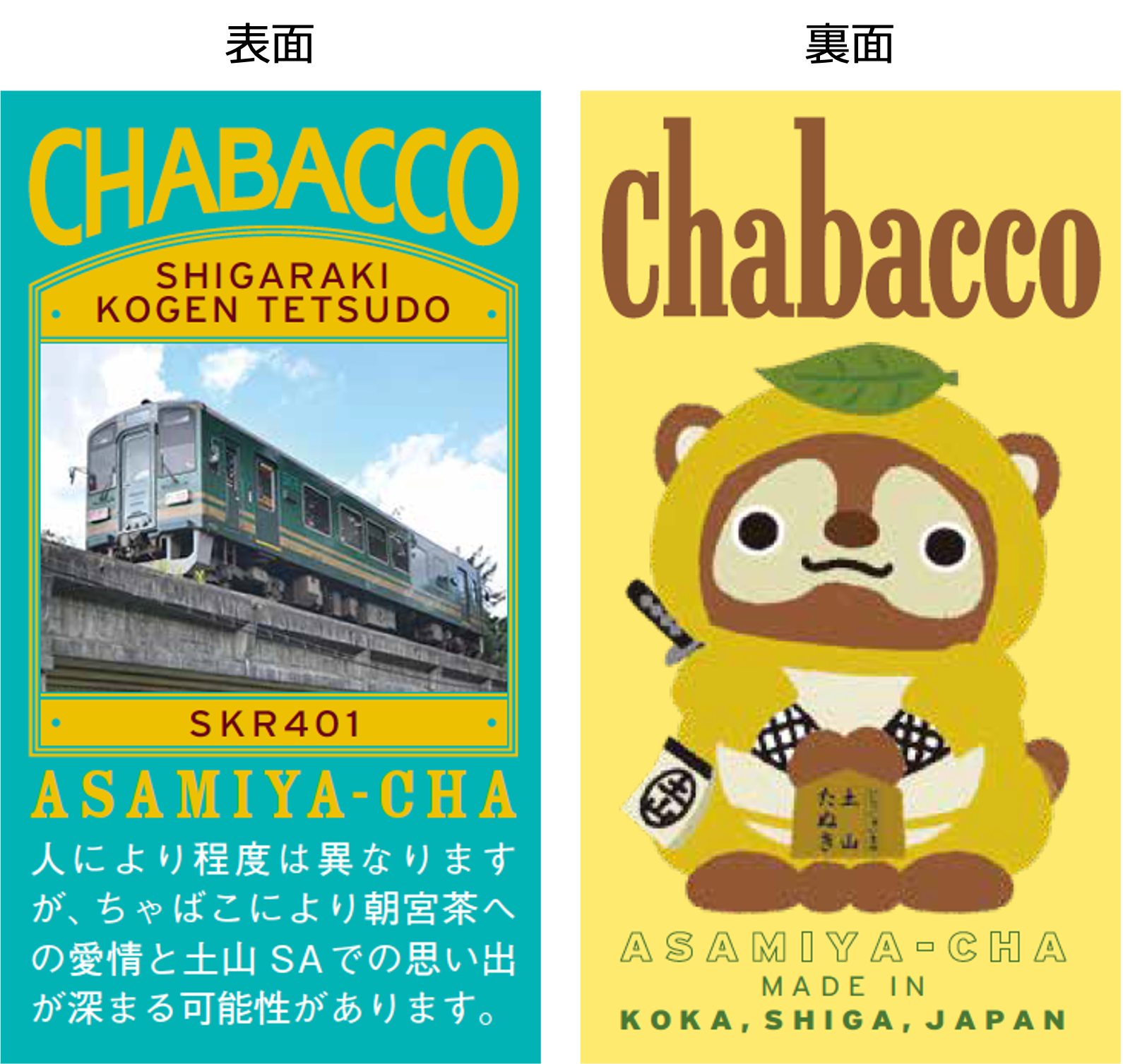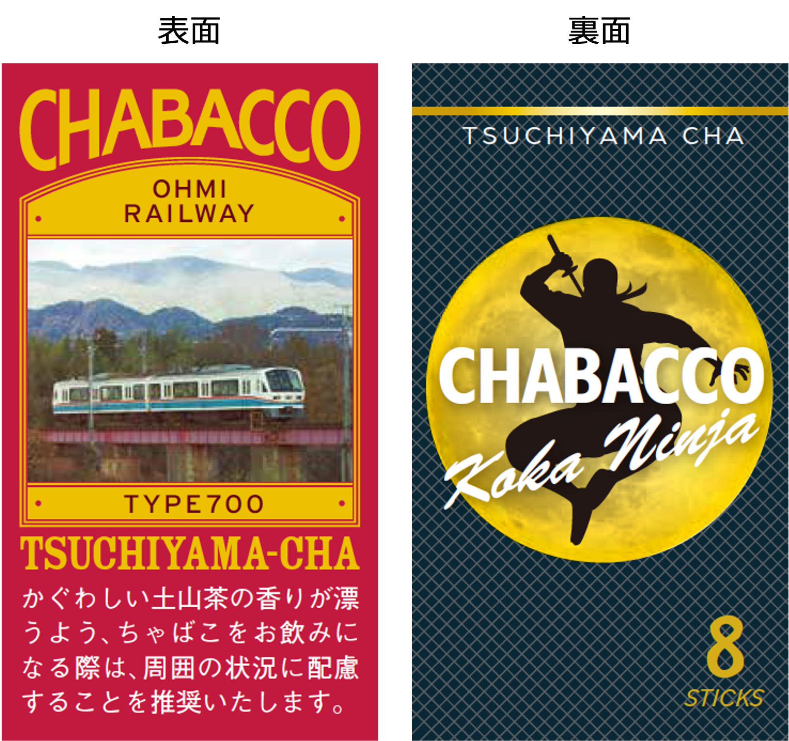 近江鉄道「彦根駅」「八日市駅」「貴生川駅」「近江八幡駅」の4駅および、新名神高速道路の土山サービスエリアに設置した自動販売機にて、朝宮茶・土山茶を使ったChabaccoを販売します。パッケージに走行する近江鉄道と信楽高原鐵道の車両に、「甲賀忍者」やマスコットキャラクターの「土山たぬき」のデザインをご用意し、地元の方はもちろん、甲賀市を訪れる国内外の旅行者のお土産にピッタリな一品に仕上げました。