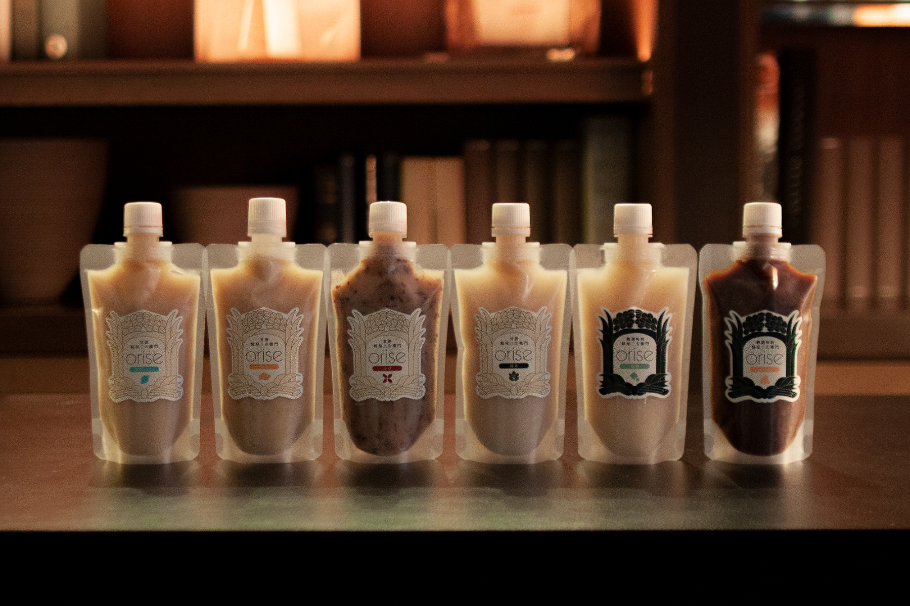 『orise』には、甘酒4種類と麹調味料2種類がございます。全て国産食材を使用し、1本1本丁寧に自社で手づくりし、火入れを行っていないため出来立てそのものの味わいとなっています。