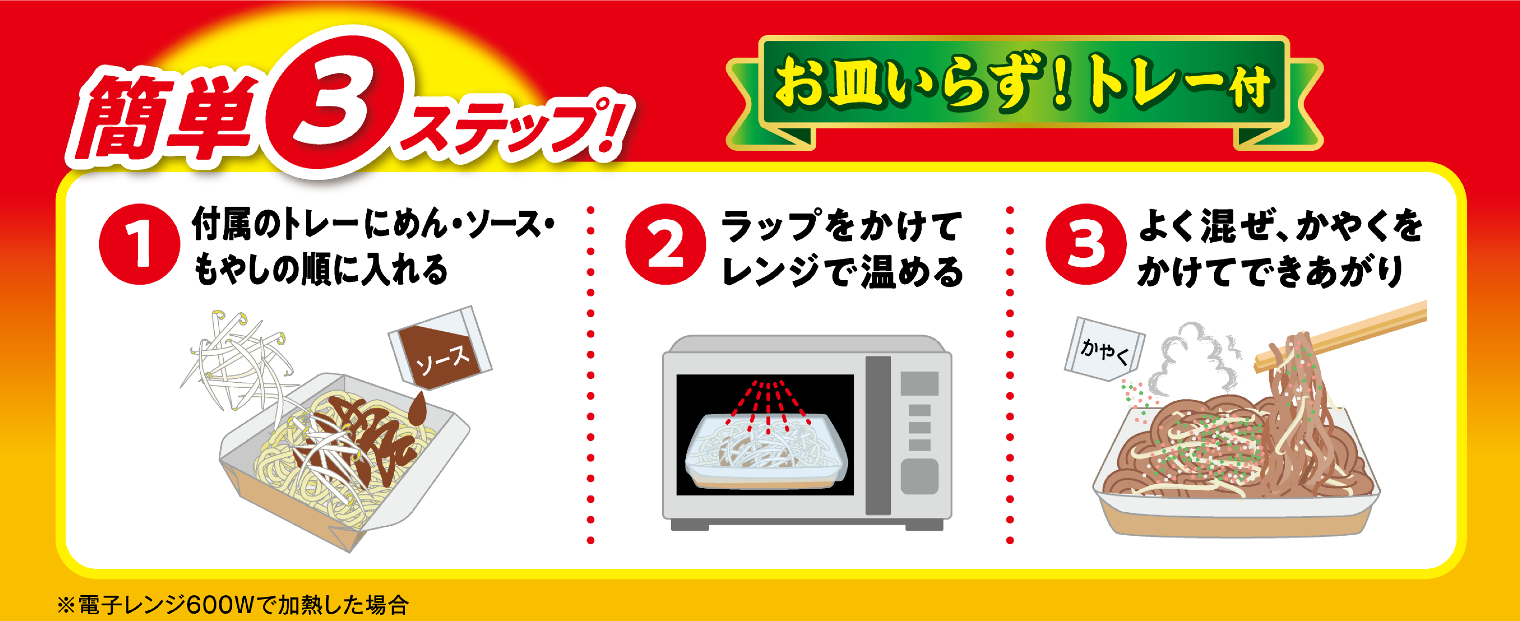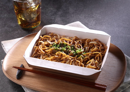 もやしをのせてレンジで3分で食べられる、紙トレー付きで準備・片付けが楽チンな焼そばです。