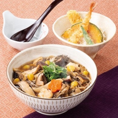 自家製くるみだれで召し上がる夢庵自慢の生(なま)蕎麦と、土佐造り風で提供する「金華〆さば」、塩焼きにした「金目鯛」、「季節の天ぷら」などのお惣菜6品で、季節を感じることのできるおもてなし和膳。天ぷらは「秋田県産白神あわび茸」・「新潟県産舞茸」・「栗」など、季節の素材を使用しました。
