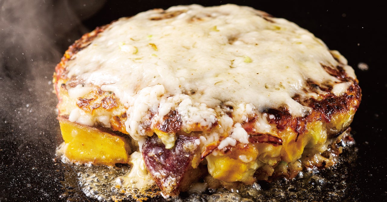 さつまいもと塩バターのマリアージュをお楽しみいただける、「甘じょっぱい」、「さつまいもお好み焼き」!