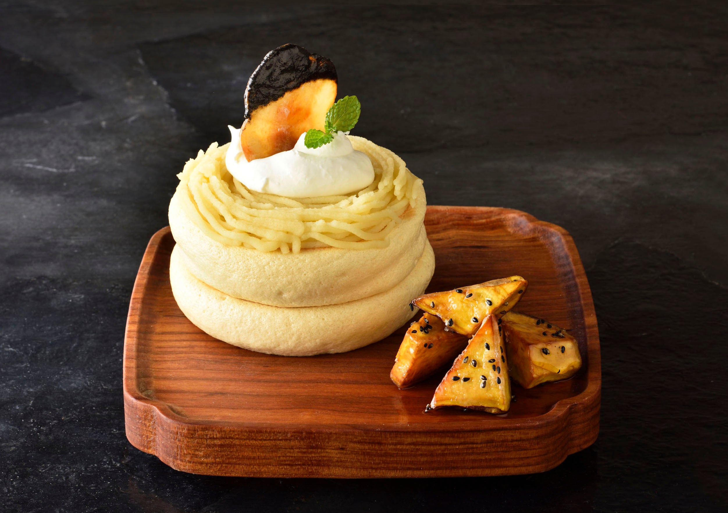 ぷるぷる食感の無添加ほっとけーきに、こっくりとした優しい味わいのなめらかスイートポテトクリームをたっぷりとのせました。その上に、フレッシュな北海道産生クリームと濃厚な黒ごまソースをディップしたさつまいもチップを飾りつけ。付け合せには黄金色に輝くホックホクの大学いもをご用意しました。