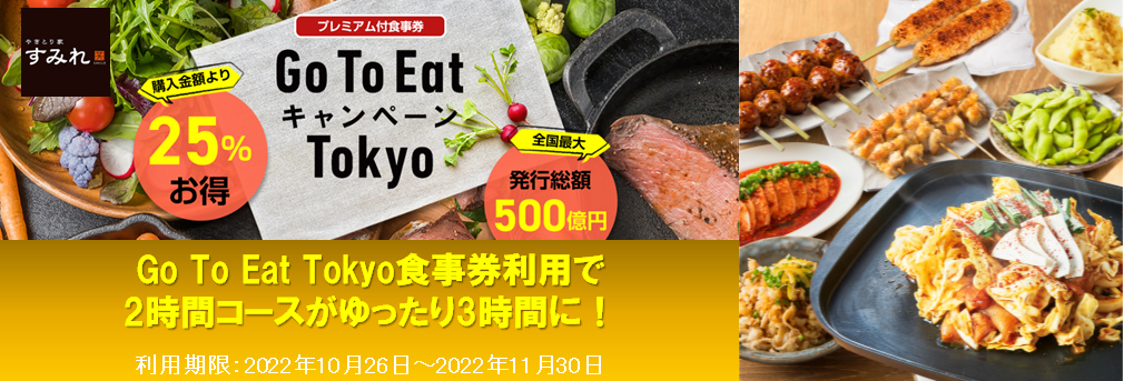 - 同時開催!大人数のご利用にお薦め。GoTo Eat Tokyoお食事券利用で、通常2時間コースがゆったり3時間に!
