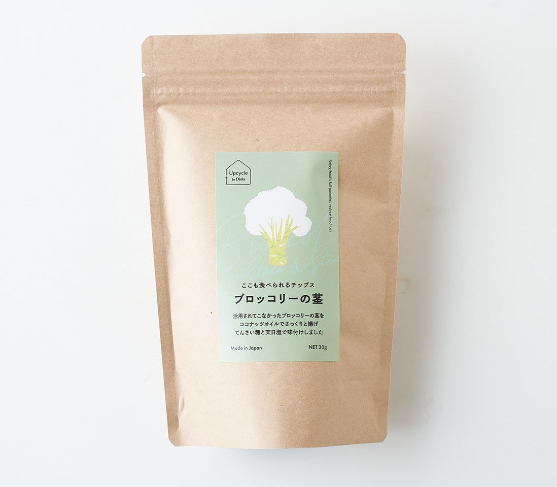 冷凍ブロッコリーのカット工場で花蕾(からい)をカットしたあとに残る茎をスティック状にして特殊フライヤーで低温フライすることで、サクサクした軽い食感のチップスにしました。 揚げ油はココナッツオイルを使用し、てんさい糖と塩で少し甘めに味付けています。