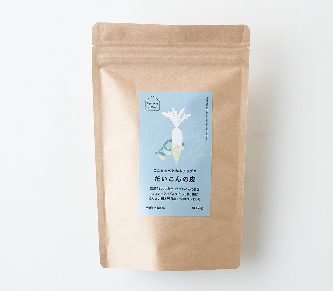 漬物工場から加工時に出る大根の皮を特殊フライヤーで低温フライすることで、パリッとした軽い食感のチップスにしました。 揚げ油はココナッツオイルを使用し、てんさい糖と塩で少し甘めに味付けています。