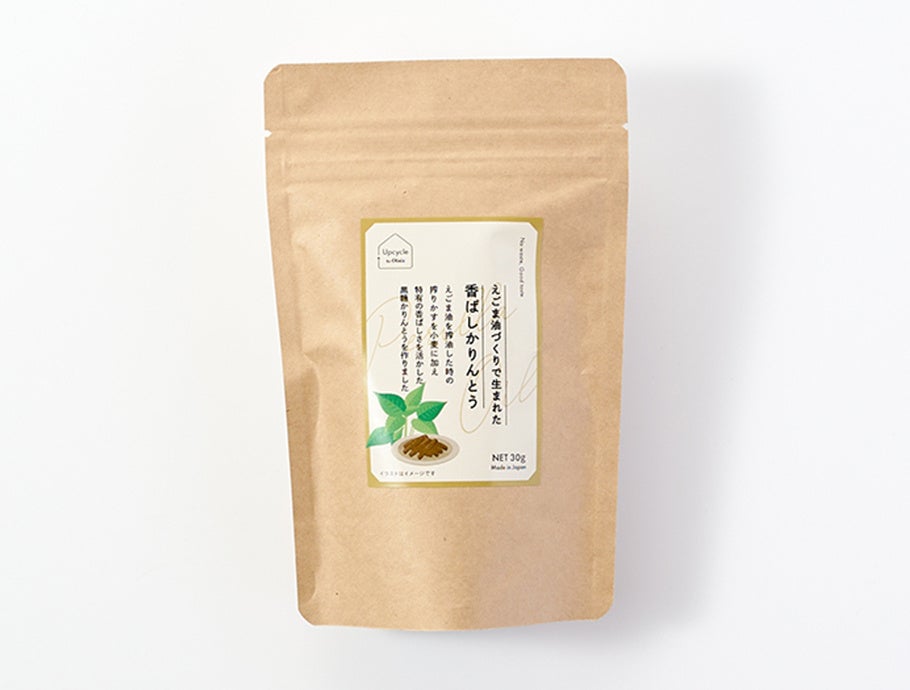 えごま油を搾油した際に残った搾りかすを国産小麦に加え、特有の香ばしさを活かした黒糖味のかりんとうに仕上げました。