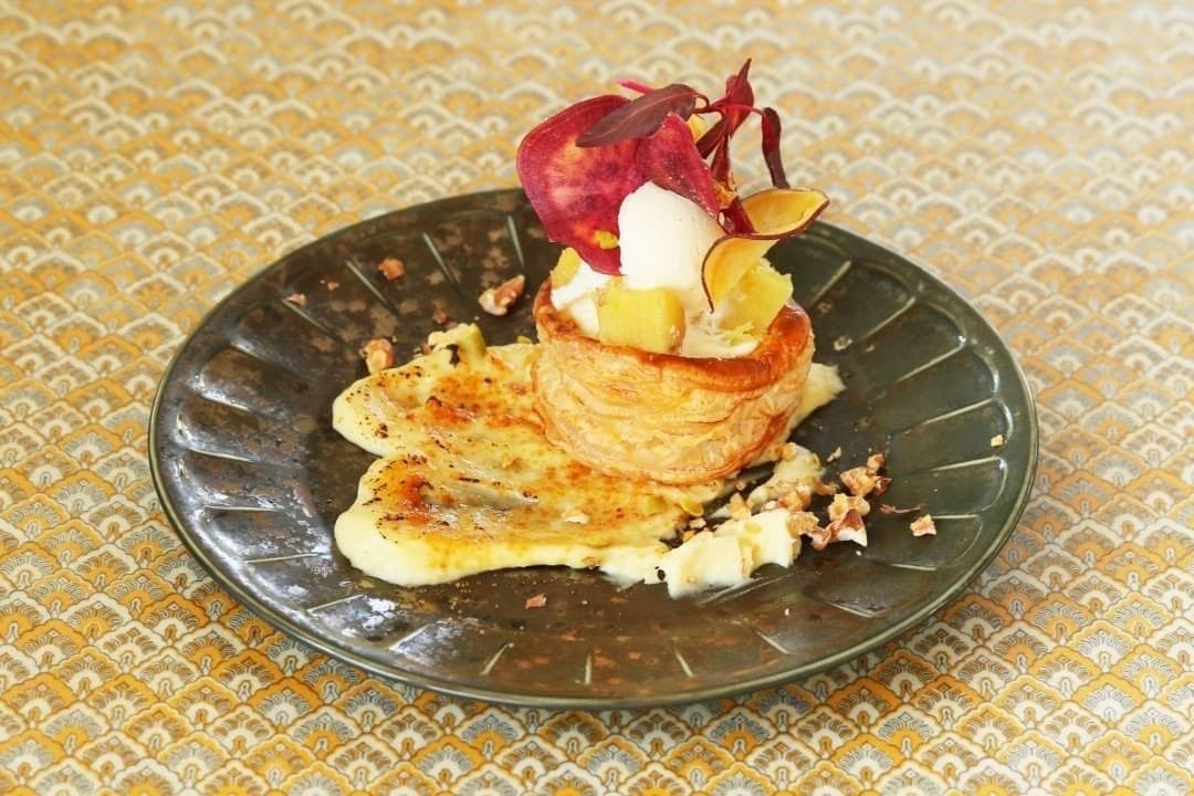 行方市産の紅はるかを使用した濃厚なクリームは、ブリュレ仕立てでご用意。さっぱりとした柑橘と一緒にお楽しみ下さい。