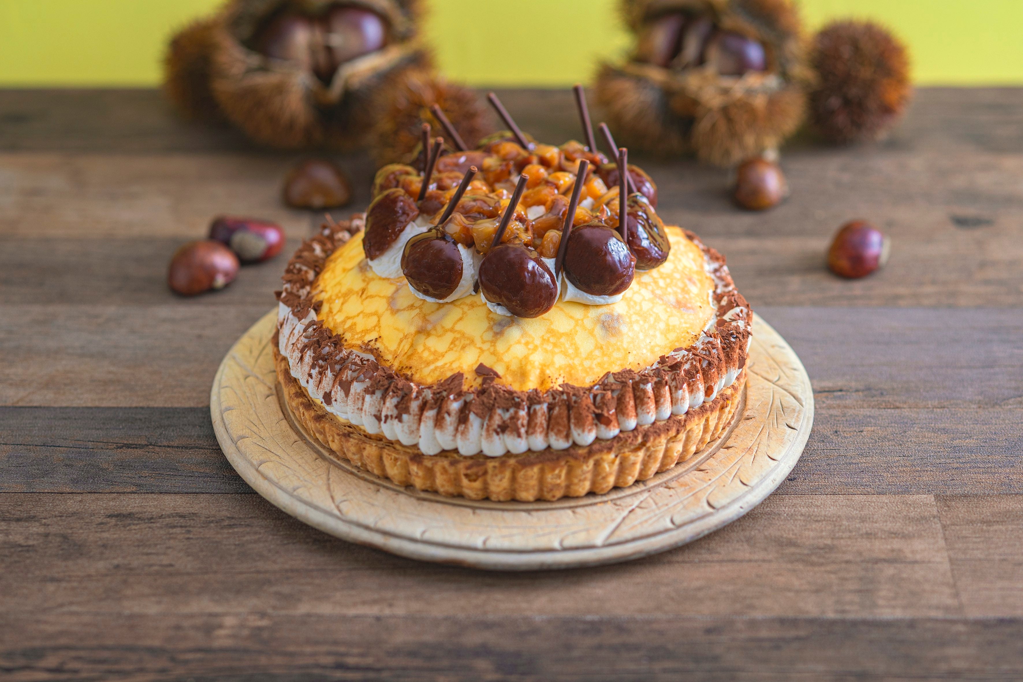 なめらかなカスタードタルトに風味豊かな笠間市の栗ペーストを使用したクリームといちご・クレープを重ねました。上品な甘さの栗の渋皮煮を飾ったタルトです。
