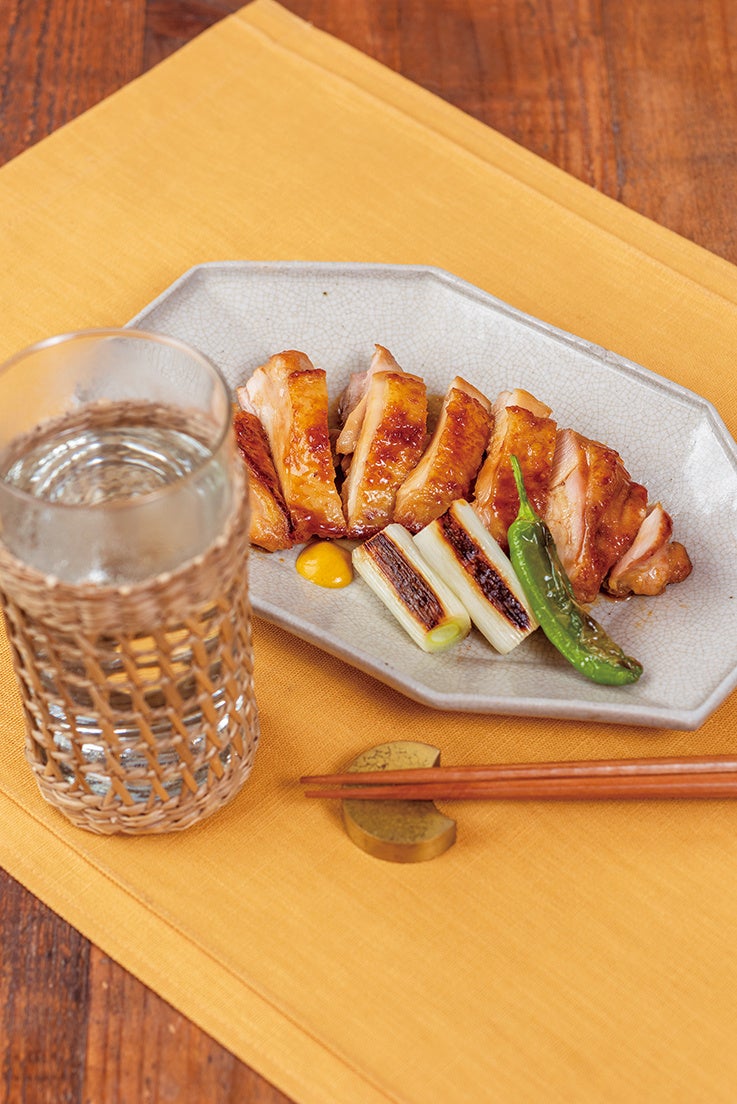 鶏もも肉一枚を半分に切り、長ねぎ1/2本は3㎝幅の筒切りに。フライパンにサラダ油小さじ1を温め、皮目を下にして鶏肉を焼き、皮目がカリっとしたら、長ねぎとししとう4本を加え、両面をじっくりと焼いて火を通す。醤油大さじ3、黒糖大さじ1、黒糖焼酎大さじ2、マスタード小さじ1をフライパンに加え、鶏肉をからめながらとろみが出るまで煮詰める。◀濃厚なタイプの黒糖焼酎には濃口醤油と黒糖の甘じょっぱさが合います。ふくよかな香りにはお湯割りかオンザロックで。