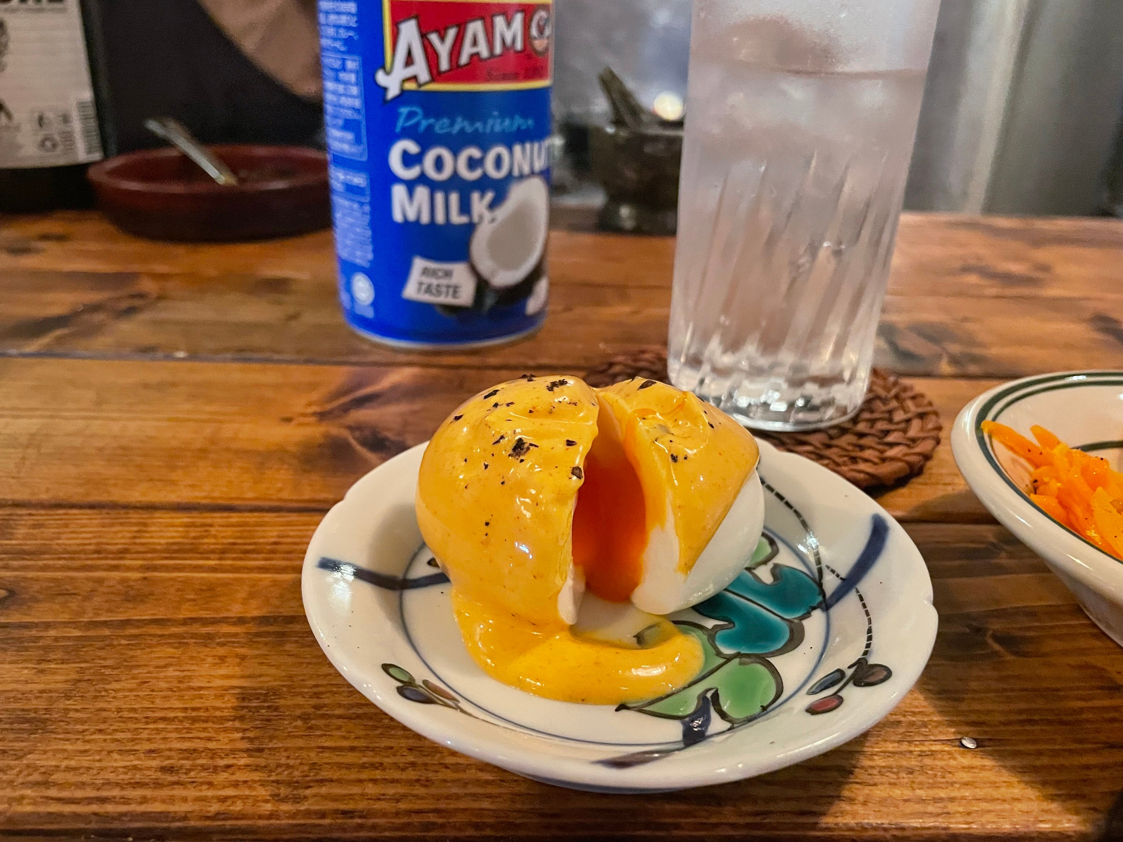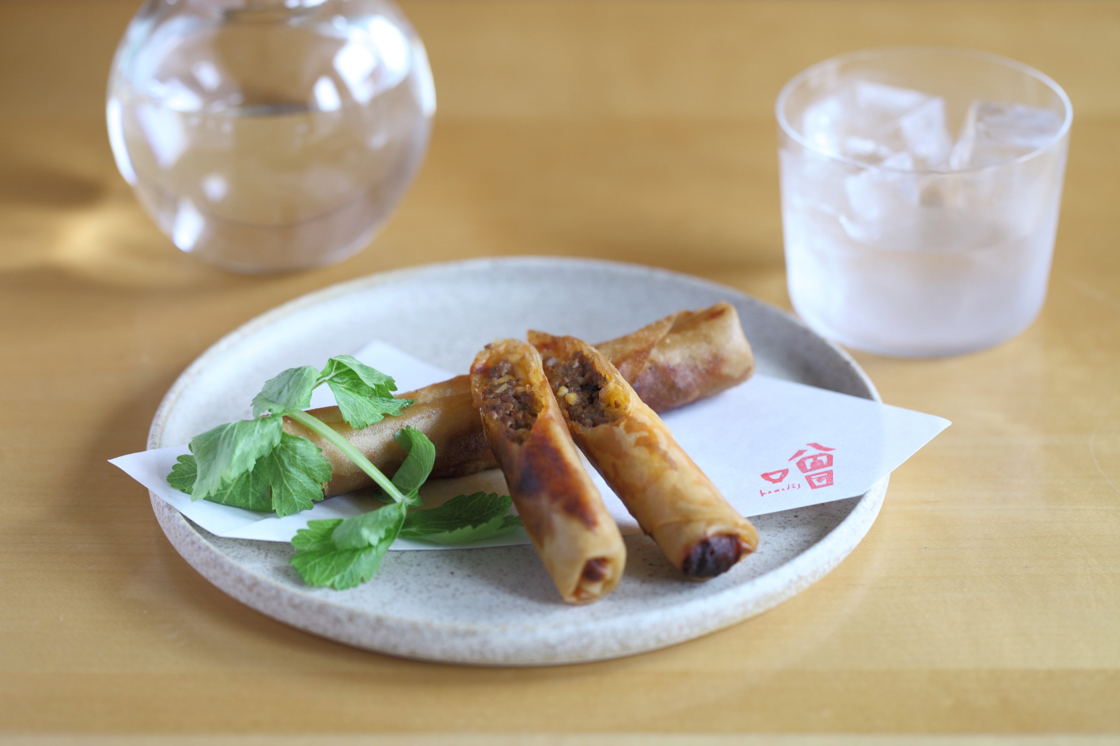虎ノ門蒸留所で自らジンを造る一場鉄平さんが「「蒸留酒をもっと日常に」という思いで、2022年3月にはじめた小料理と蒸留酒の店。発酵食、ハーブ、スパイスを和食にうまくとりいれたエスニックなテイストが、焼酎や泡盛に合うと評判をよんでいます。「遊牧民の納豆春巻」は、ラムの挽き肉と納豆というとクセの強い具材をクミンとナツメグがつなぐ、スパイシーなおつまみ。伊豆大島の「御神火凪海」をロックで。島の名物、クサヤと合うというだけあって、クセの強いものを受け止める大らかなペアリングです。「白身魚の発酵白和え」は、酒粕とクリームチーズを練り上げた衣で白身魚を和え、砕いた黒豆を散らした一品。八丈島の「情け嶋」の酵素シロップサワーのすっきりした飲み心地が相性抜群。発酵食と合わせることで麹由来の複雑な香りが昇華します。