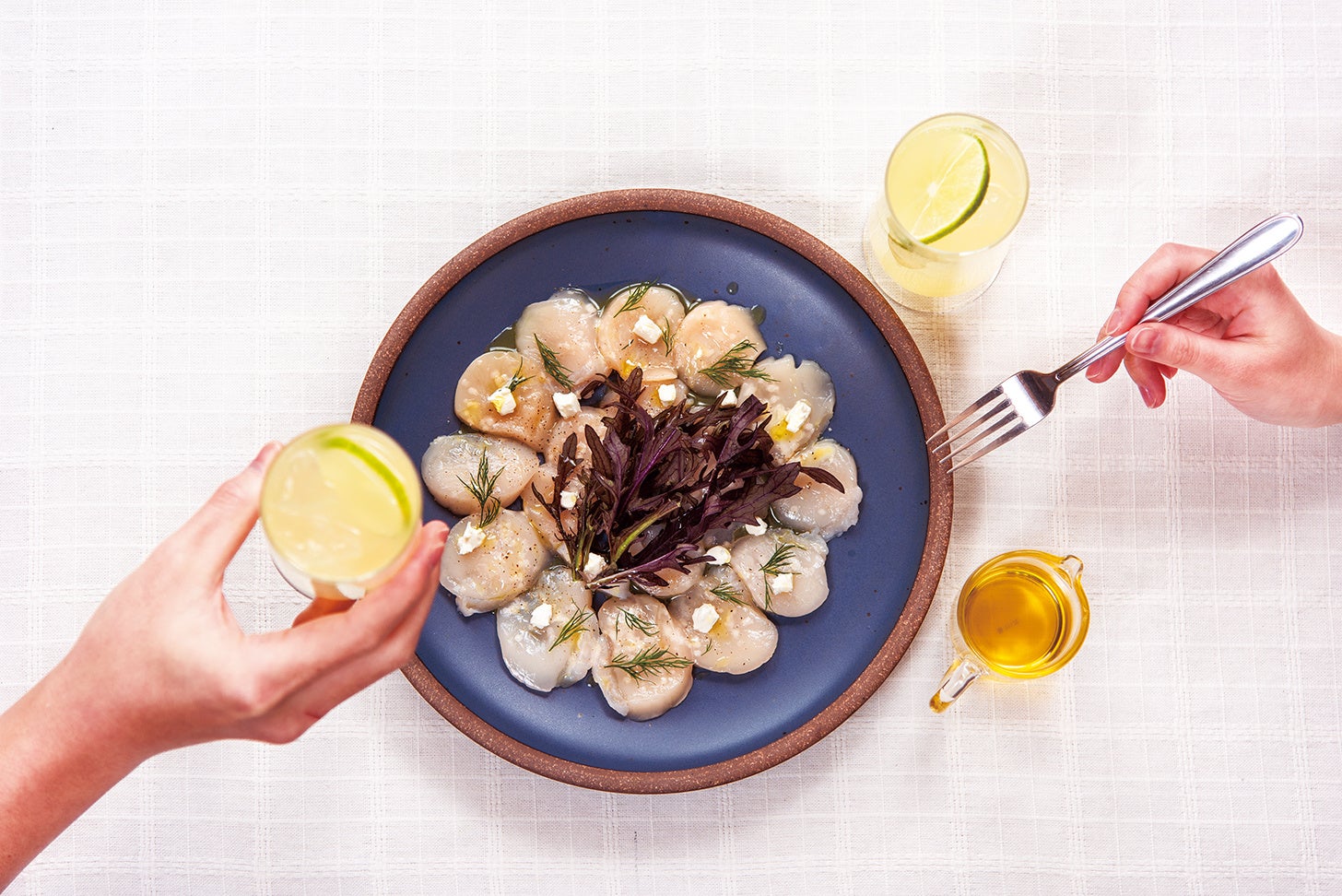 刺身用のホタテ150gをそぎ切りにして皿に広げるように盛り付ける。塩と黒こしょうを少々ふり、5㎜角に切ったクリームチーズを散らし、シークゥ―サーの果汁大さじ1とオリーブオイル大さじ2を回しかけ、ディルを添える。◀シークゥ―サーがなければスダチやカボスでも。柑橘系を搾った水割りやソーダ割りがよく合います。