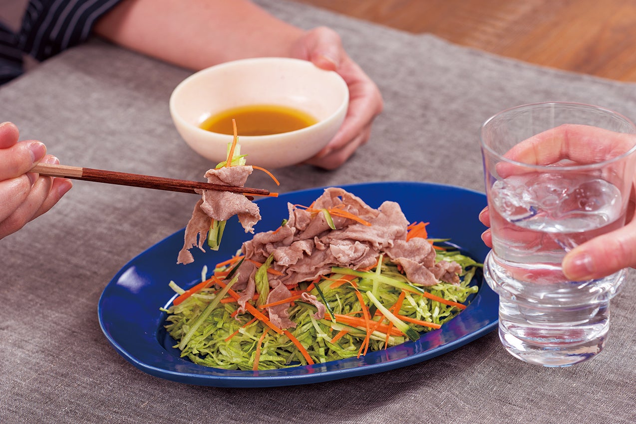 鍋に湯を沸かし、塩を軽く加えて、しゃぶしゃぶ用の牛肉200gをサッと火を通したら、氷水に入れてザルで水気を切る。きゅうり1/2本、レタス4枚、人参1/4本は千切りにして器に盛り、牛肉をのせて、ぽん酢とごまだれ各大さじ1と1/2、オリーブオイル大さじ3を混ぜたタレを添える。◀ごまの香りがポイント。すっきりとした飲み心地の水割りがおすすめ。