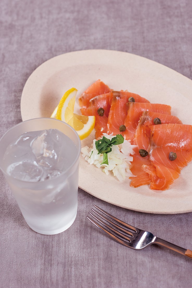 玉ねぎ1/4個をみじん切りにし、水に15分ほどさらして水気をしっかり切ります。器にスモークサーモン60gを並べ、ケイパー大さじ1/2を散らし、玉ねぎと刻んだイタリアンパセリ、レモンの薄切りを添えます。◀すっきり軽い爽やかなタイプの麦焼酎とスモークサーモンはベストマッチ。玉ねぎやパセリが引き立て役に。トーストしたライ麦パンを添えたら◎。水割りかオンザロックでどうぞ。