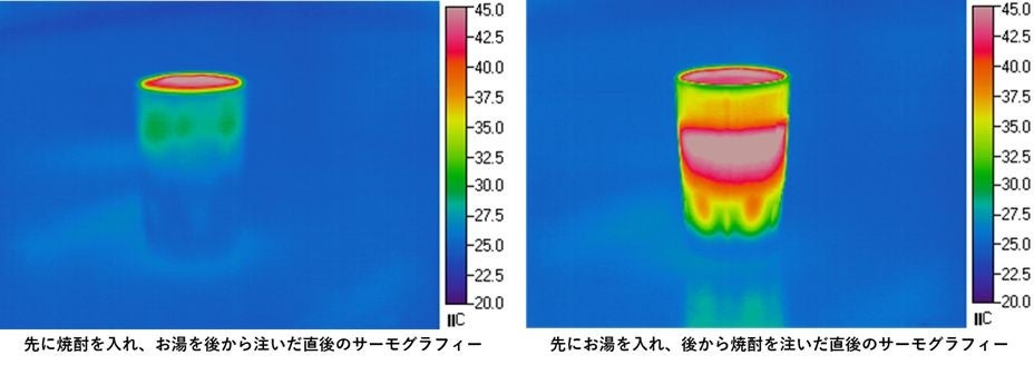 焼酎を先に注いだ結果、表面は40℃近くまで上がるが、下部は25℃。一方、お湯を先に注ぐと中心温度が40℃~44℃に、グラス全体が温まっていることが確認できる。
