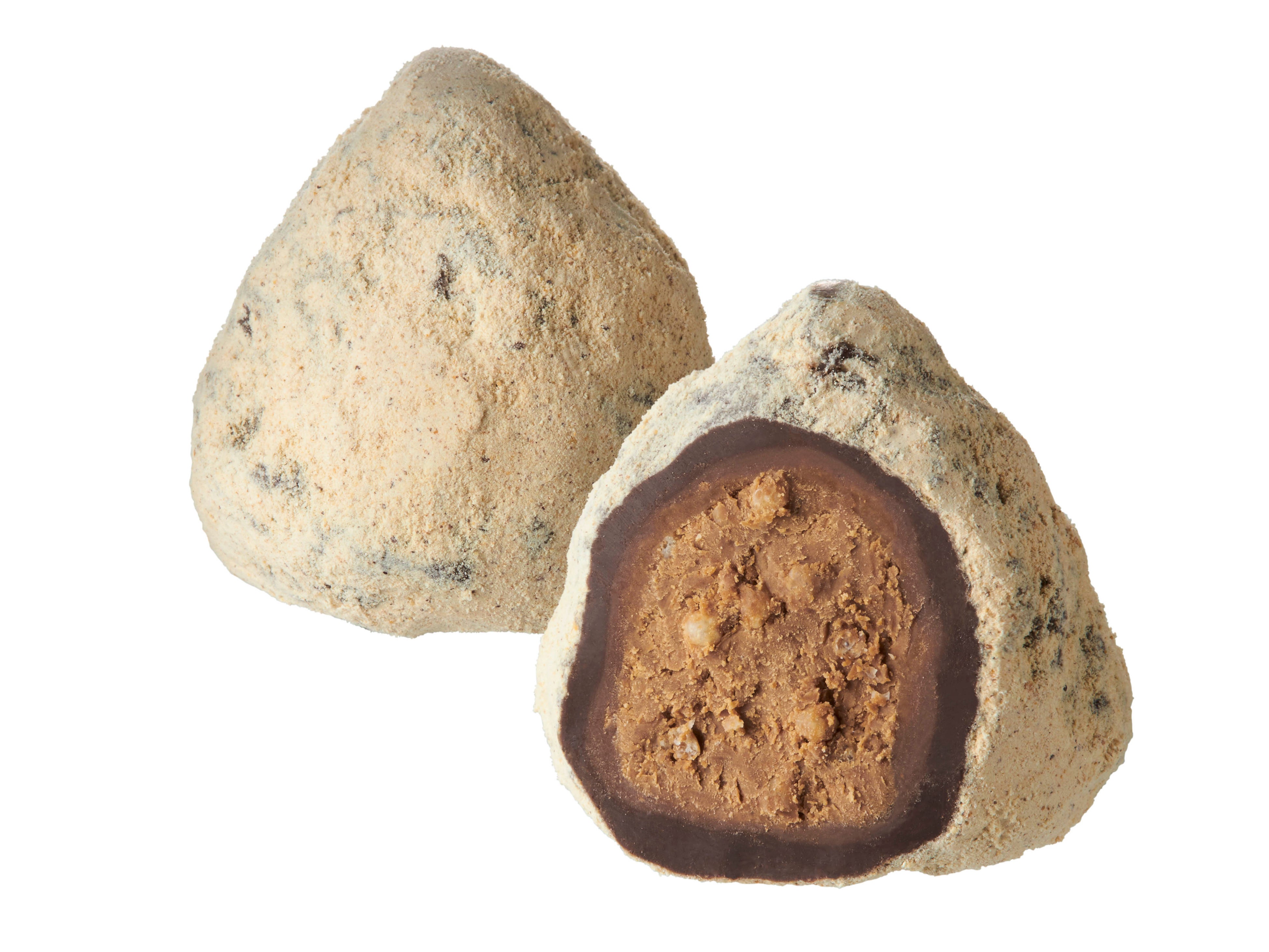 1950年誕生。風味豊かなプラリネムースをダークチョコレートで包み、 ゴディバ初のプラリネトリュフとして、創業者ピエール・ドラップスが愛したダークチョコレートフレークで飾りました。味わい深く軽やかで、当時そのままの形のトリュフとして愛されてきた作品です。