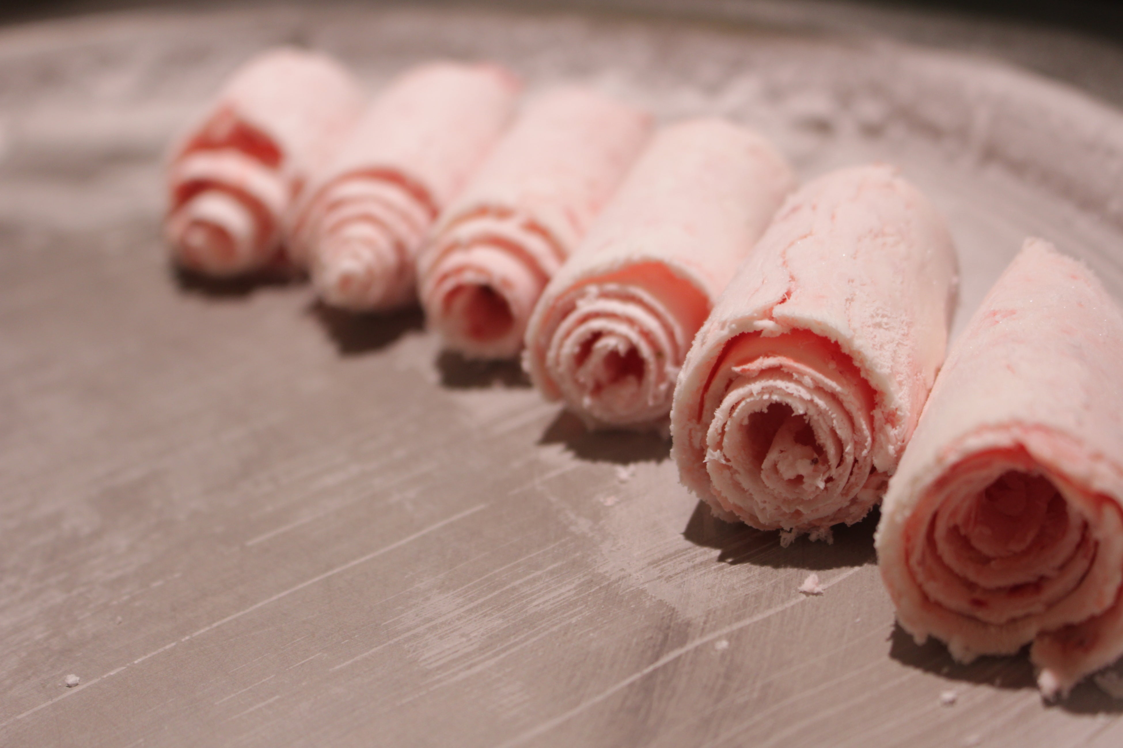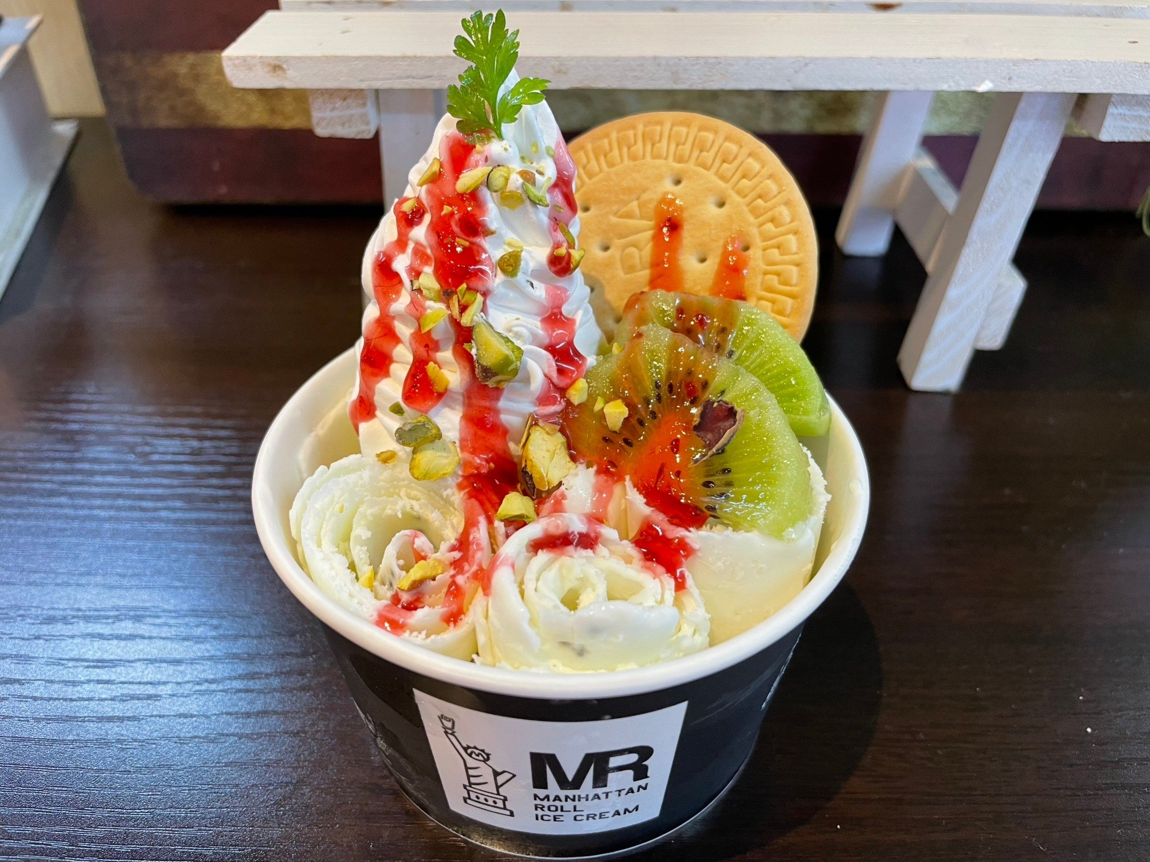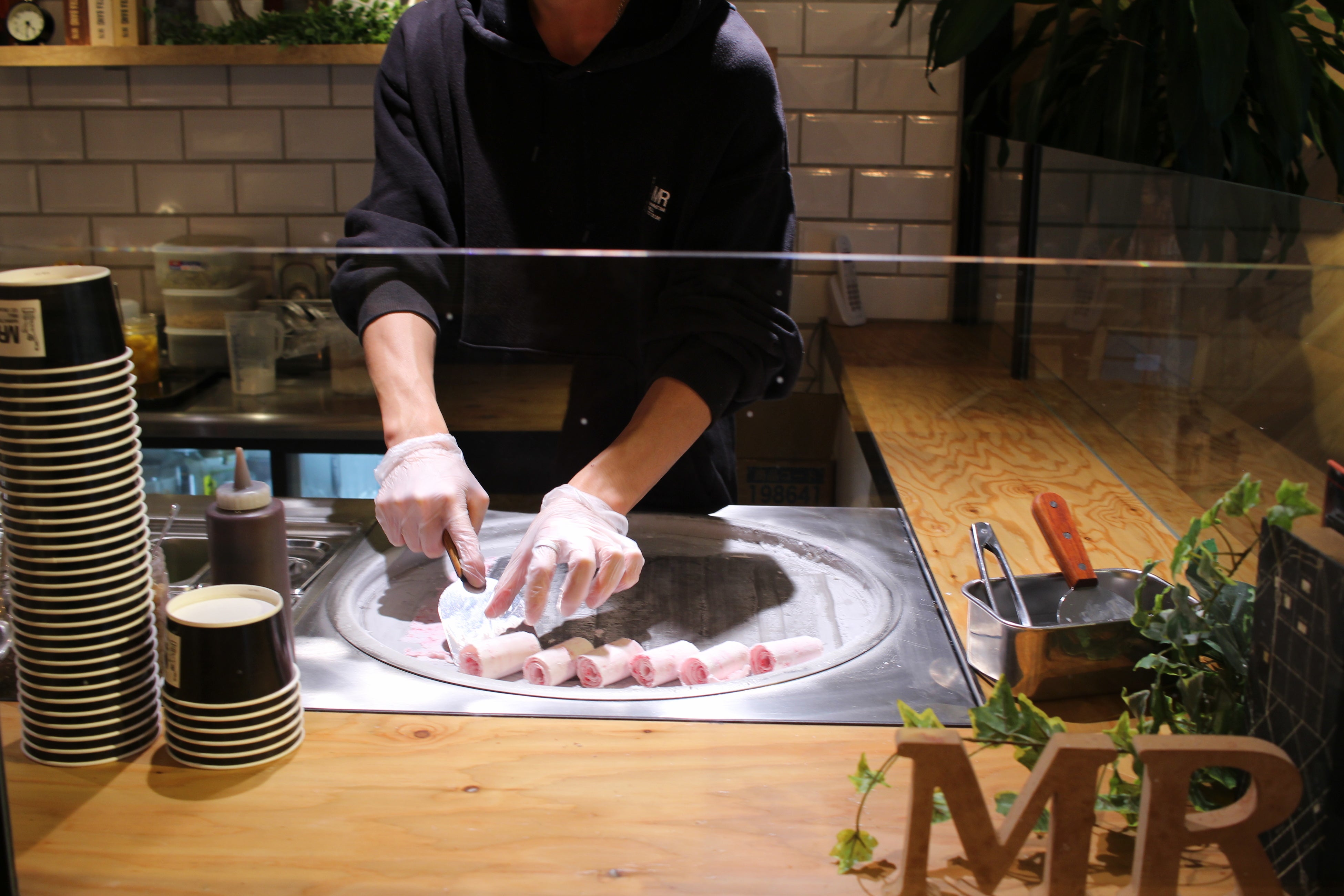 ロールアイスとは、マイナス20度以下のコールドプレートの上に、液状のアイスベースを乗せ、固まったものを薄く伸ばして丸めたアイスの事です。当店では、オリジナルのアイスベースに、様々なフルーツやチョコなどを追加することで、多様なメニューをご用意しております。味のベースとなるアイスにもこだわり、一般的なアイスに使われている卵を使用せず、店舗にて牛乳、生クリーム、シロップを独自の配合で合わせる事で、滑らかで濃厚なのに、甘すぎないアイスクリームを実現。またトッピングやアイスのベースには、フレッシュフルーツ(冷凍ではないもの)を使用する等、見るだけでなく味でもしっかり満足して頂けます。