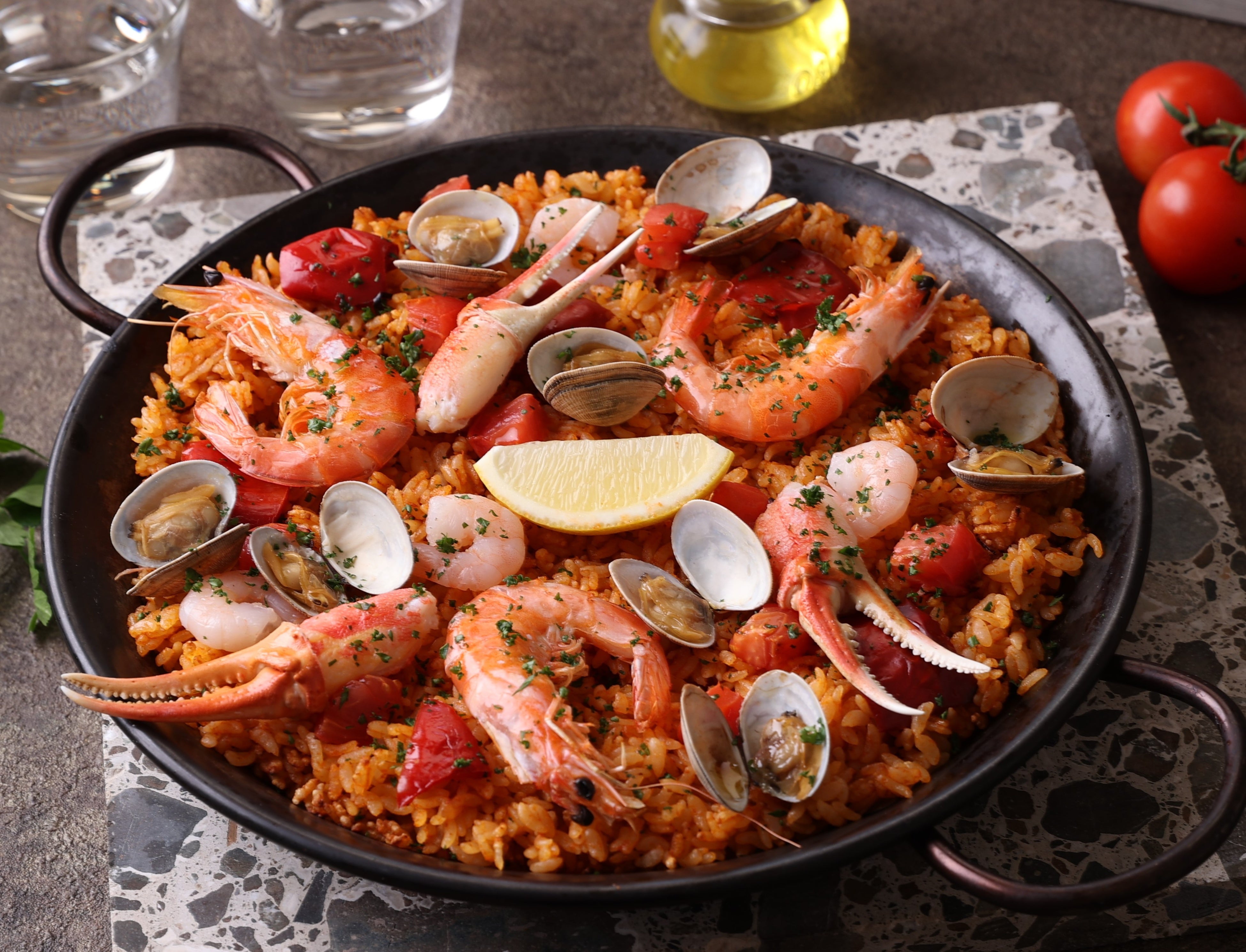 肉厚なカニ爪、有頭海老が豪華に食卓を彩るアツアツのパエリアを、ぜひお試しください。