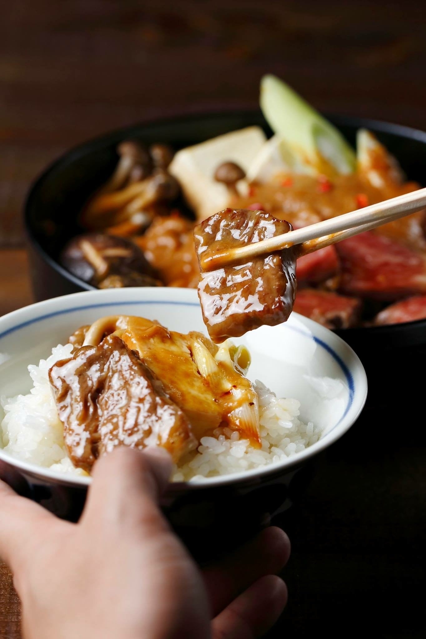 名物牛鍋と一緒に味わってほしいのが土鍋ご飯です。富山県産コシヒカリを土鍋で炊き上げることで、お米一粒一粒がピンと立っておりツヤツヤ。中はふっくら仕上がり、咀嚼するごとに滲み出す甘さが特製味噌にぴったり。味噌が絡んだお肉でご飯が進み、ご飯でお肉が進んでしまうという無限リピート。どれだけでも食べられます。
