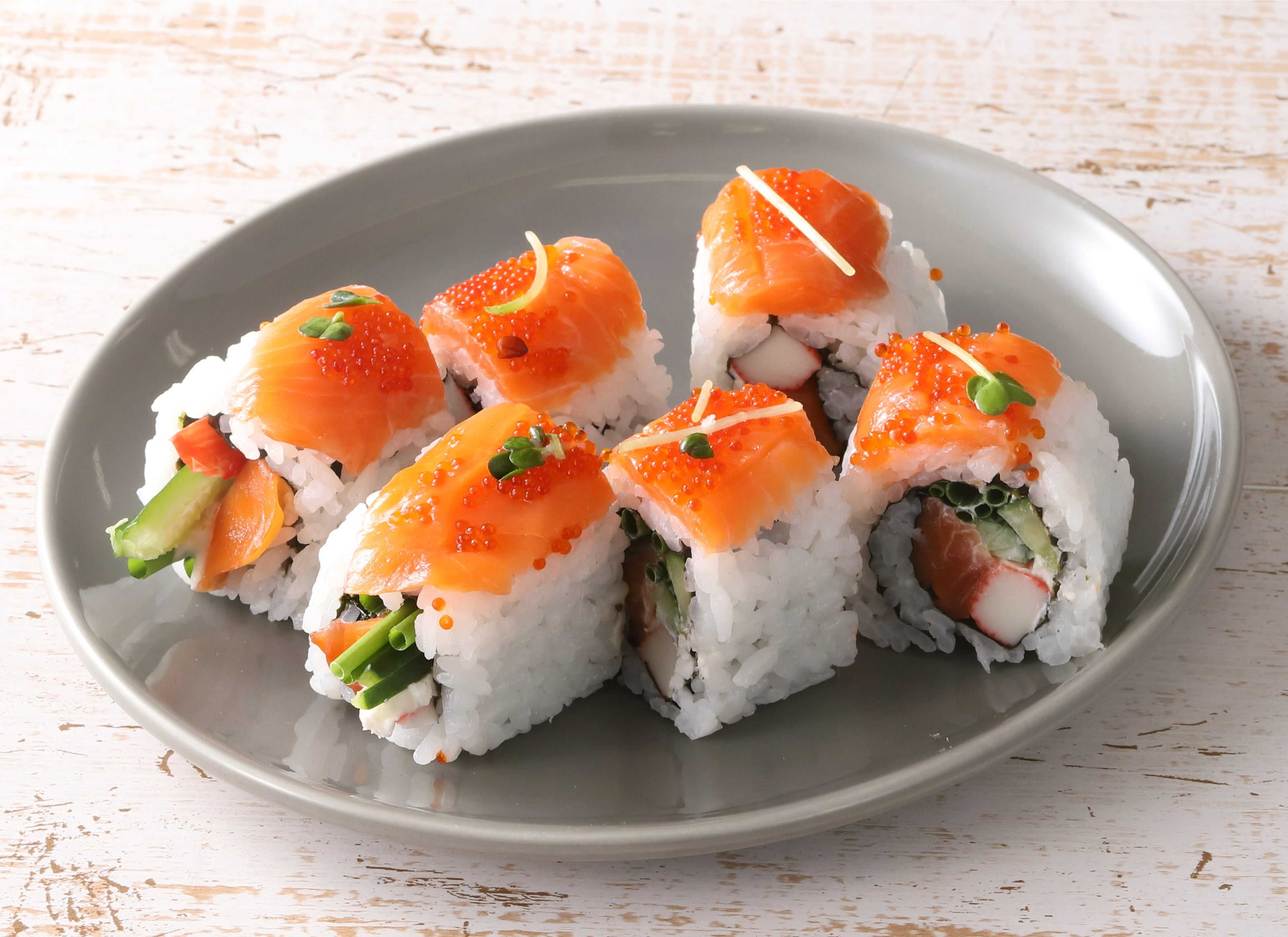 チーズとサーモンの相性がばっちりな寿司ロール。ワインのお供にもぴったりな一品。