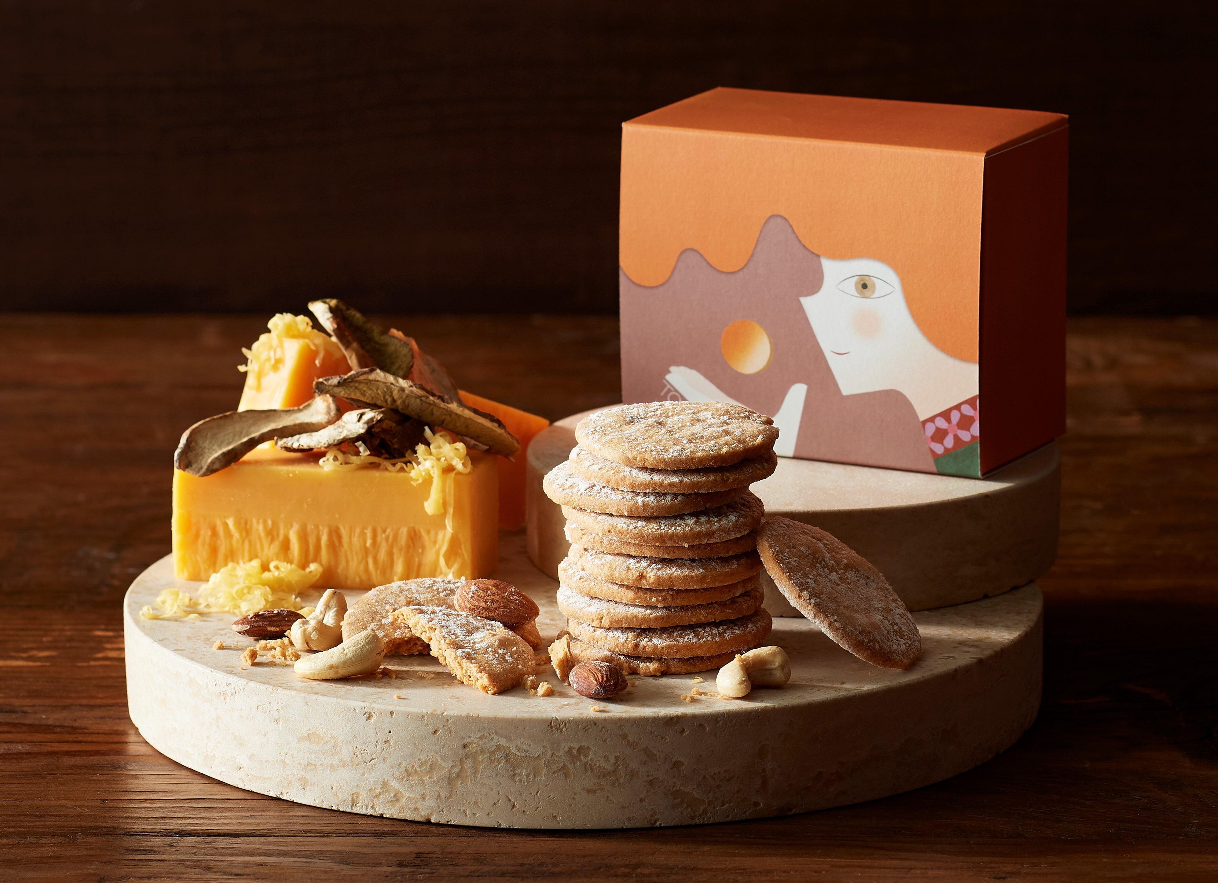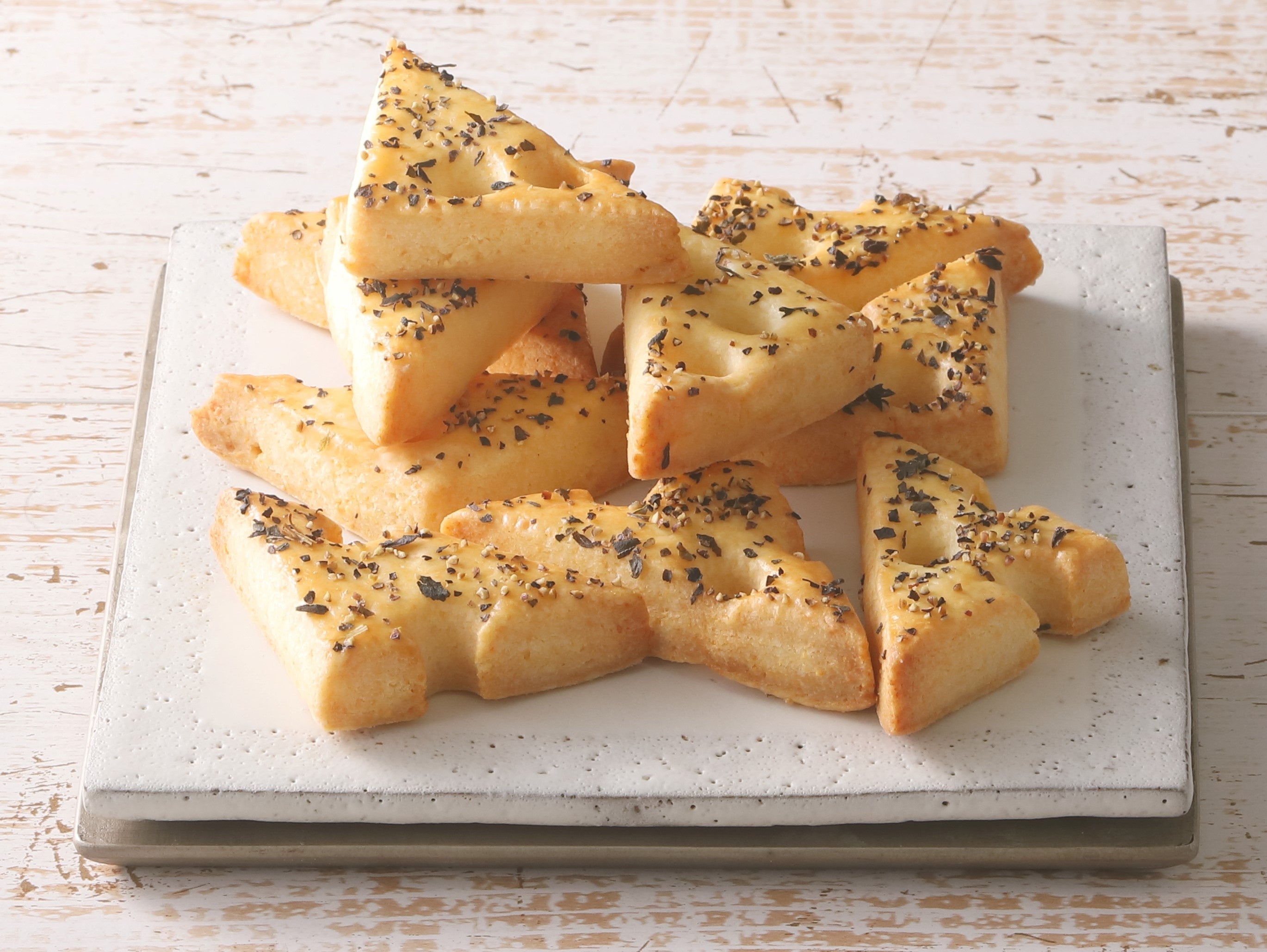 エダムチーズを使い、表面にバジルとブラックペッパーをまぶして焼き上げたクッキー。チーズをモチーフにした見た目も可愛いクッキーです。