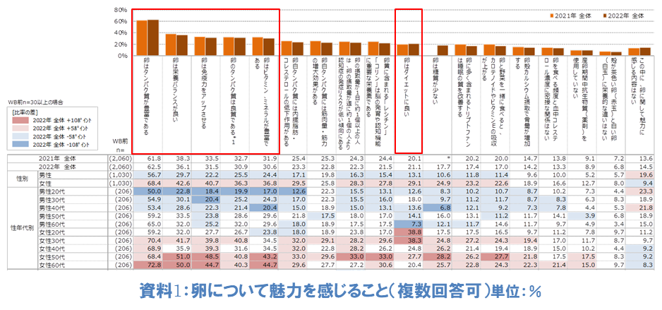 「卵の一週間の購入個数」について尋ねた結果(資料なし)をみると、30代以上の女性は、平均で週に6個以上購入しており、卵に多くの魅力を感じているのではないかと推測されます。
