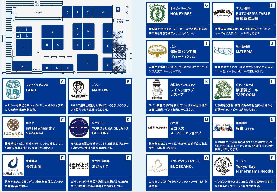 「横須賀と言えば」のお店、一店舗営業にこだわる地元人気店が二店舗目として出店、東京の人気店が三浦半島の食材を使って出店するなど、施設のコンセプトに共感してくださった以下の事業者が出店されています。