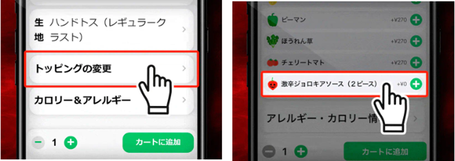 お好きなピザの注文時に、追加料金0円で選択が可能です。ご注文いただくと、8分割(M・Rサイズ)もしくは12分割(Lサイズ)のカットのうち2ピースに、激辛ジョロキアソースがランダムにトッピングされます。