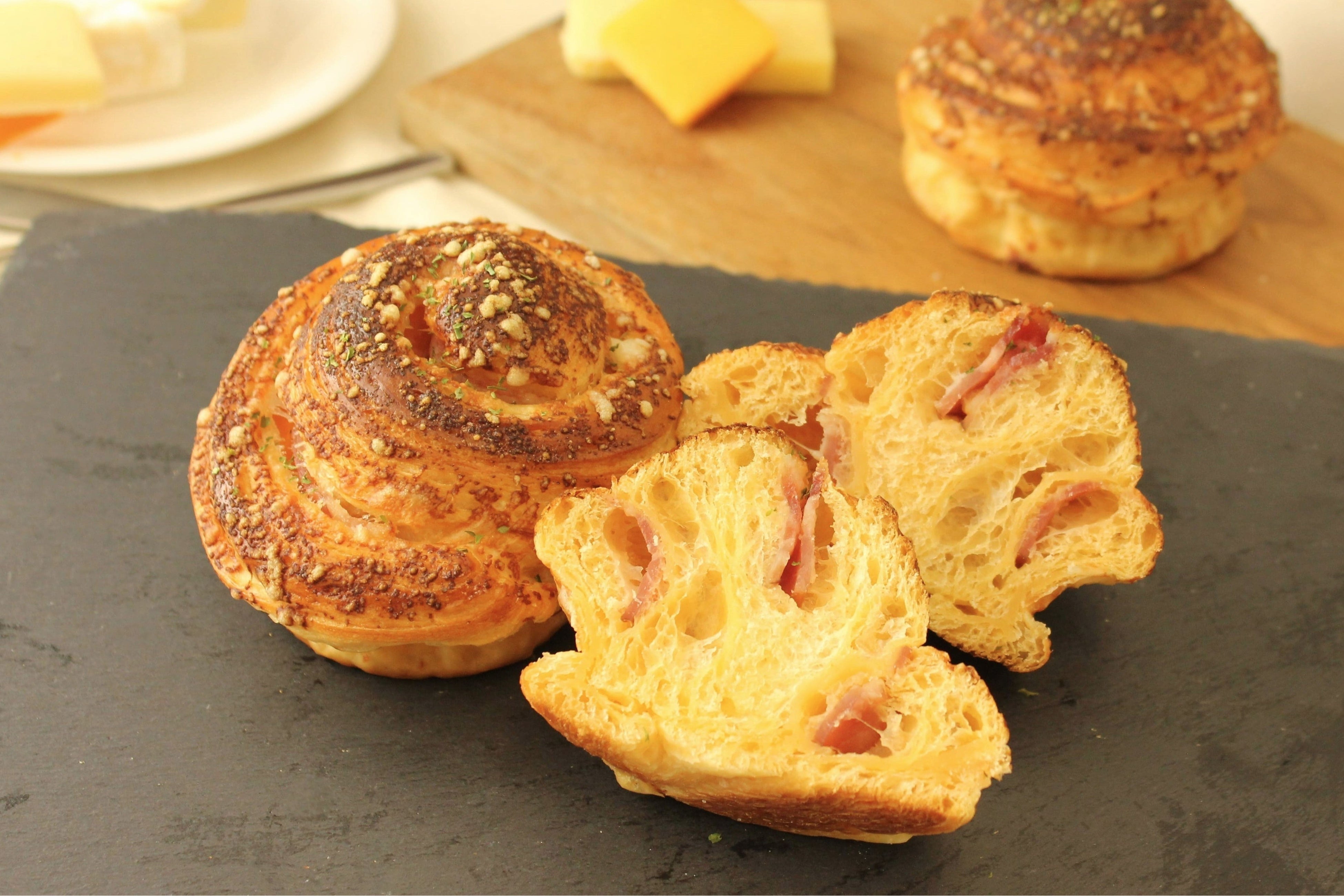 3種のチーズ(クリーム、チェダー、カマンベール)を使用したチーズ風味のデニッシュ生地に、ベーコンを巻き込み、仕上げにパルメザンチーズをかけて焼き上げました。手に取った瞬間からしっかりと香るチーズの風味に、噛みしめるほどに広がるベーコンの塩味が相性抜群。