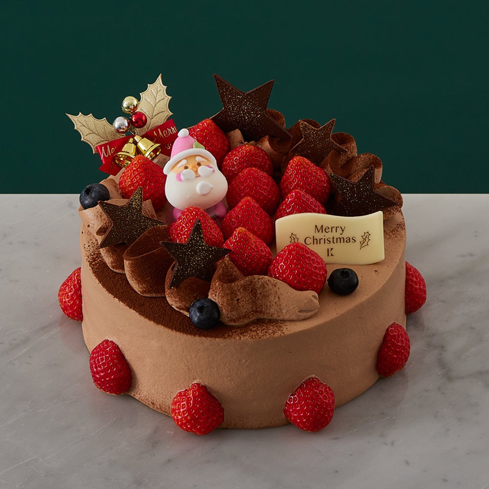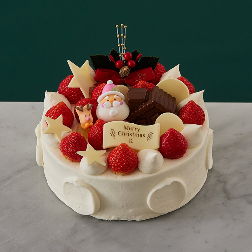 ホワイトチョコレートの星が輝き、イチゴとサンタとお家のデコレーション。