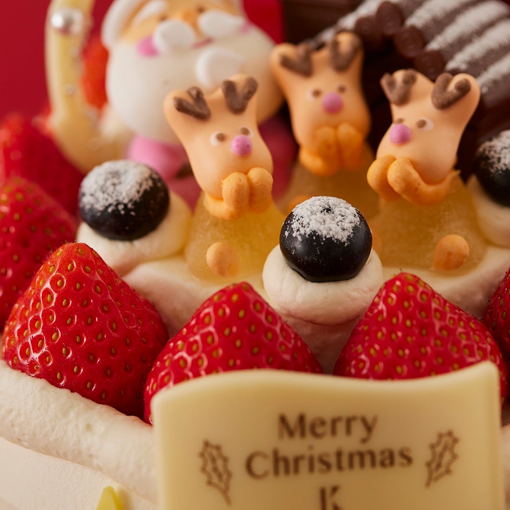 たっぷりの苺を贅沢に並べ、サンタやたくさんのトナカイを飾った、