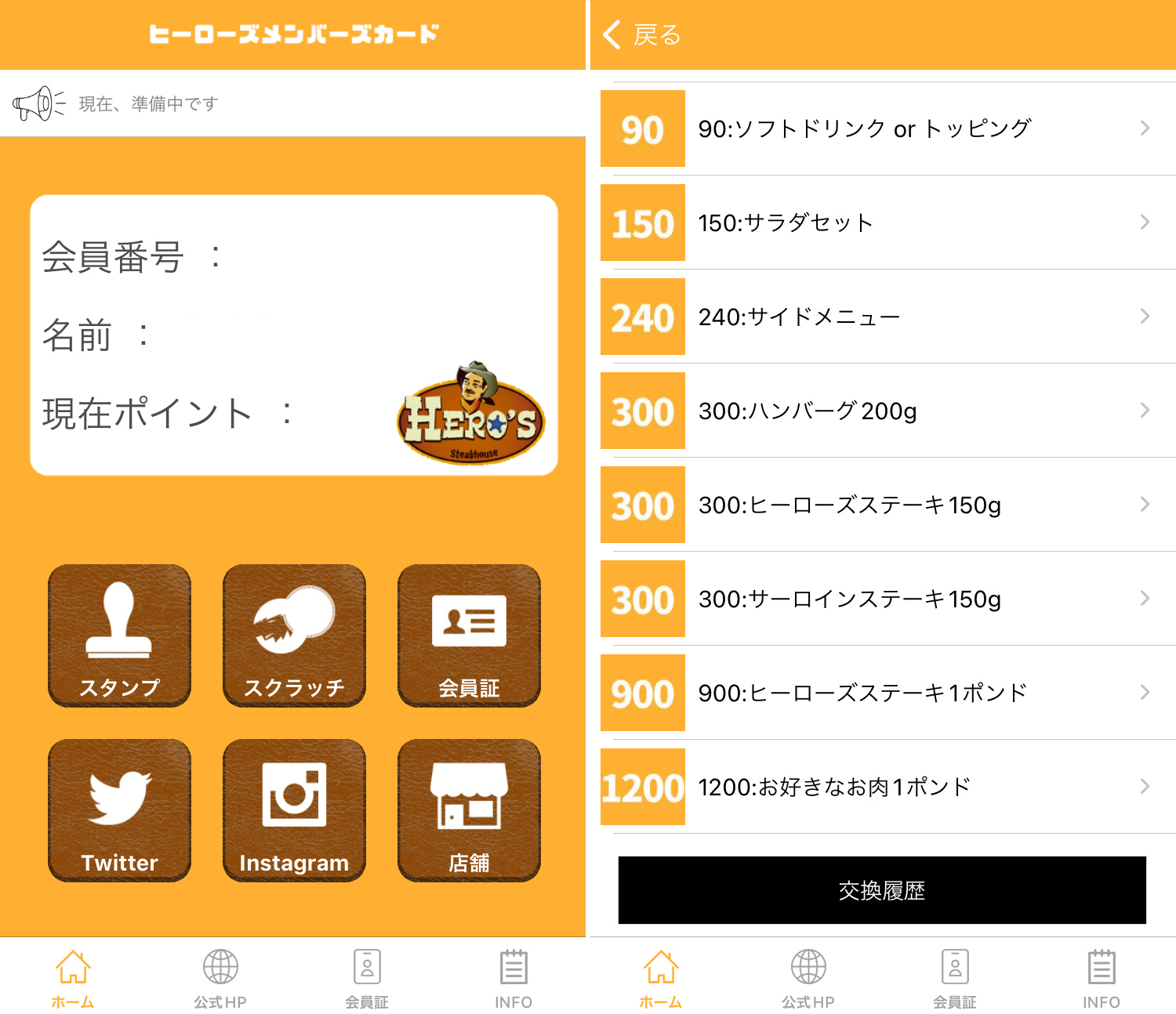 - 300ポイント:サーロイン150g or ハンバーグ200g or ヒーローズステーキ150g