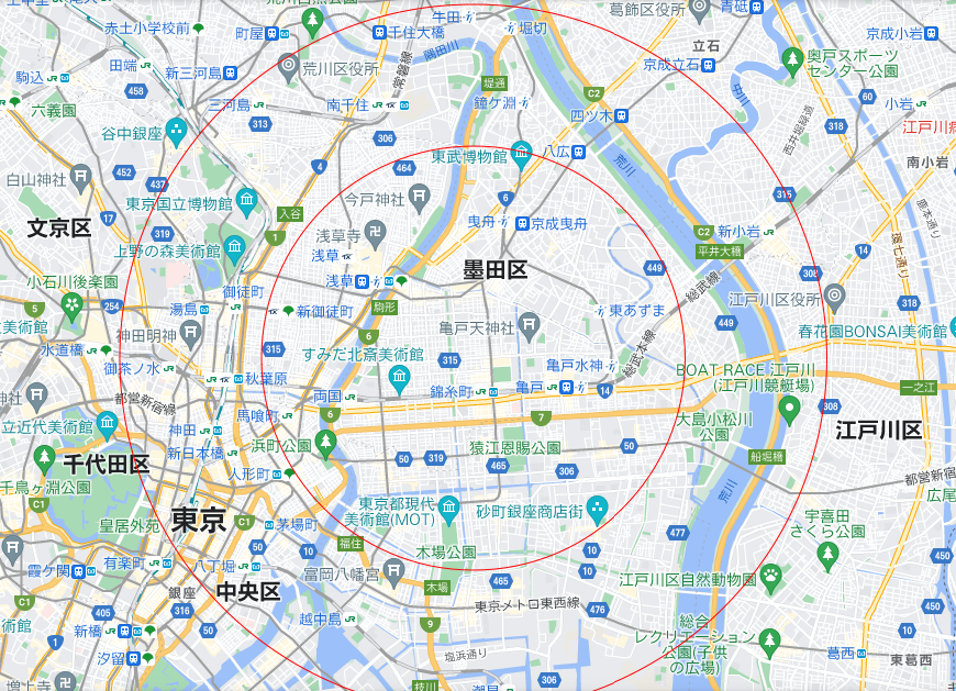 台東区、墨田区、千代田区、中央区、江東区、江戸川区、荒川区などの一部