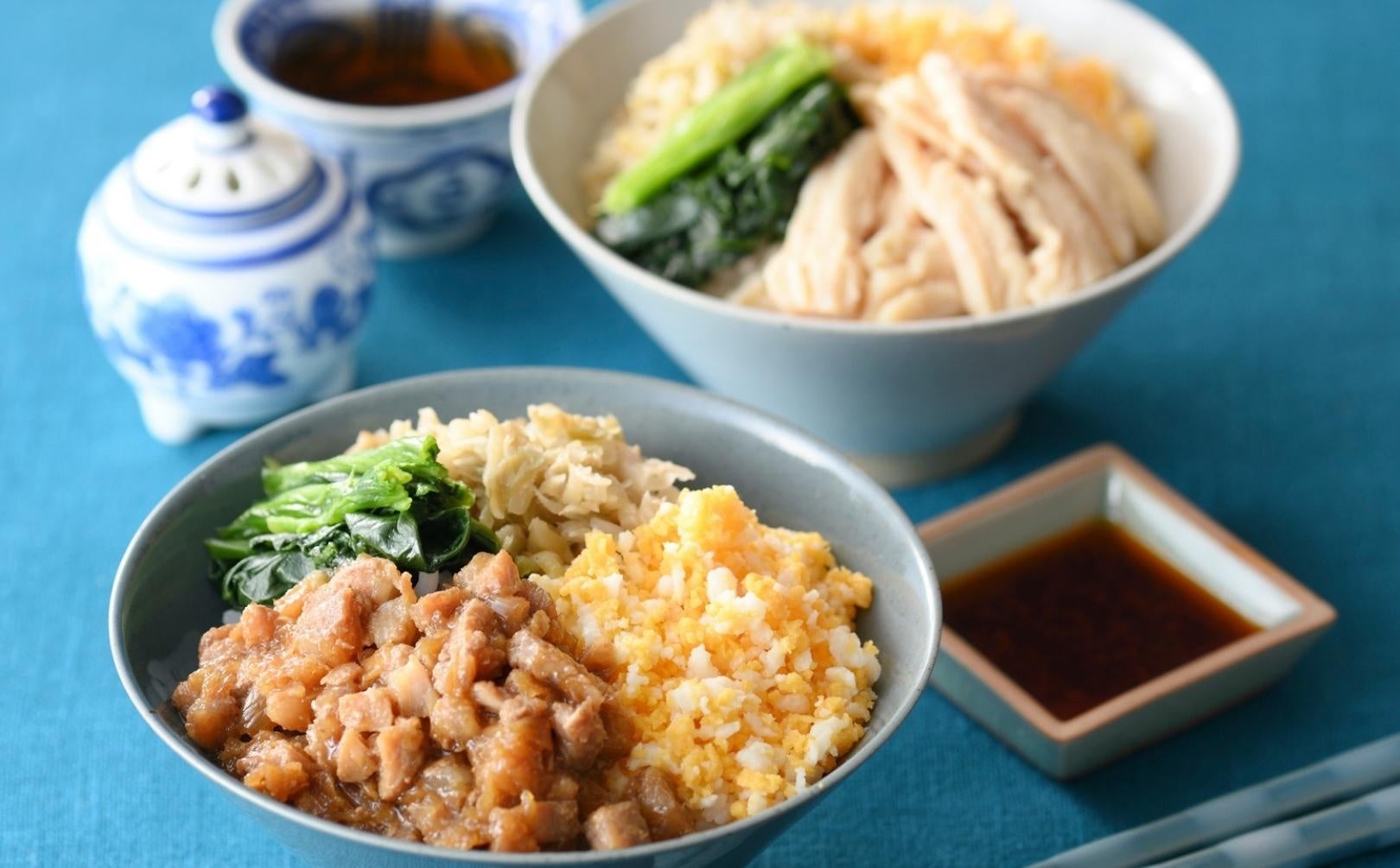 その台湾屋台飯の大定番!甘辛い豚ひき肉がご飯との相性抜群な『魯肉飯(ルーローハン)』と、さっぱりとした蒸し鶏のほぐしにコクのある旨みたっぷりのたれをかけた『鶏肉飯(ジーローハン)』。