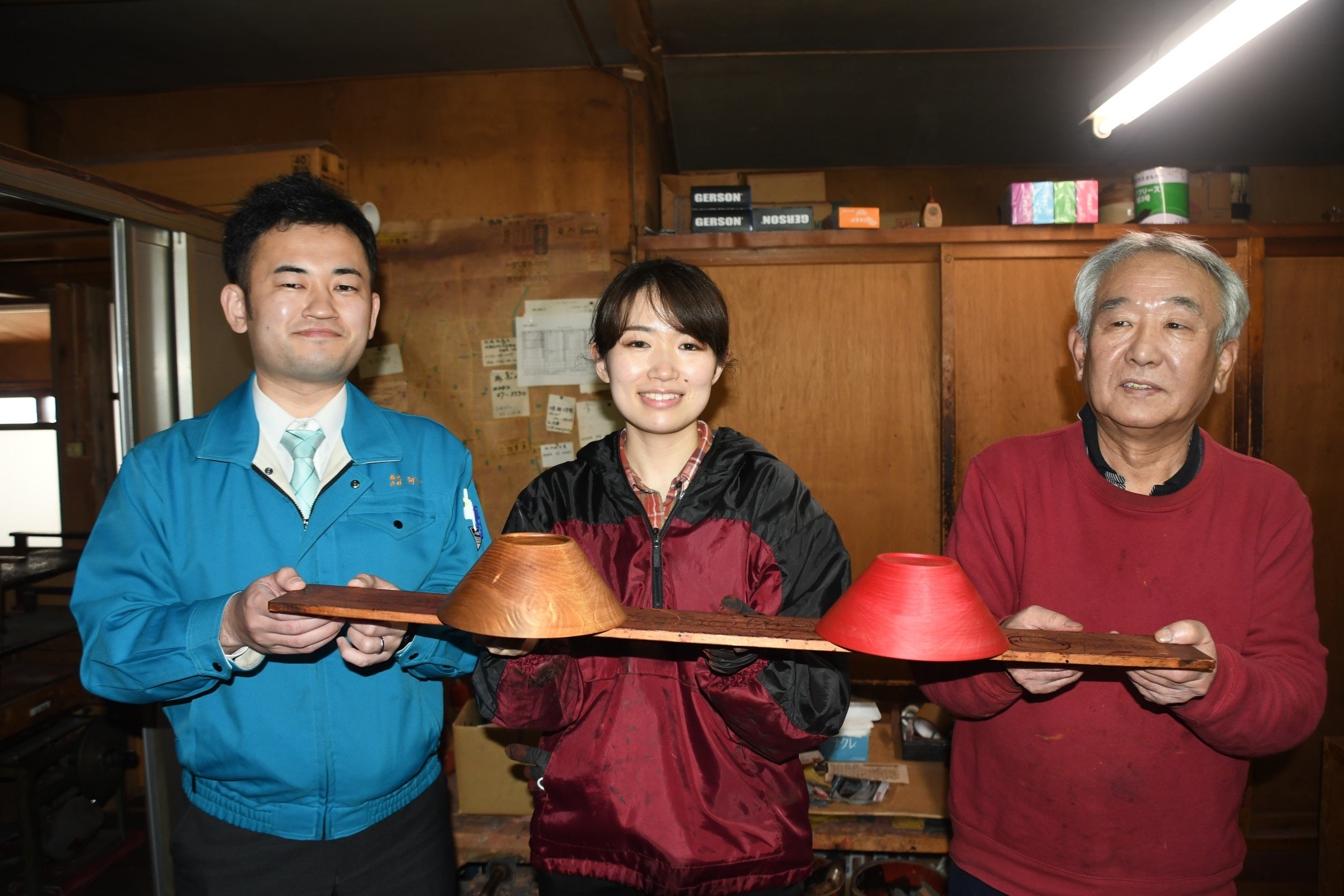 (作成に携わったメンバー、左から株式会社河京の佐藤、地域おこし協力隊の吉田、喜多方の塗師の風間)