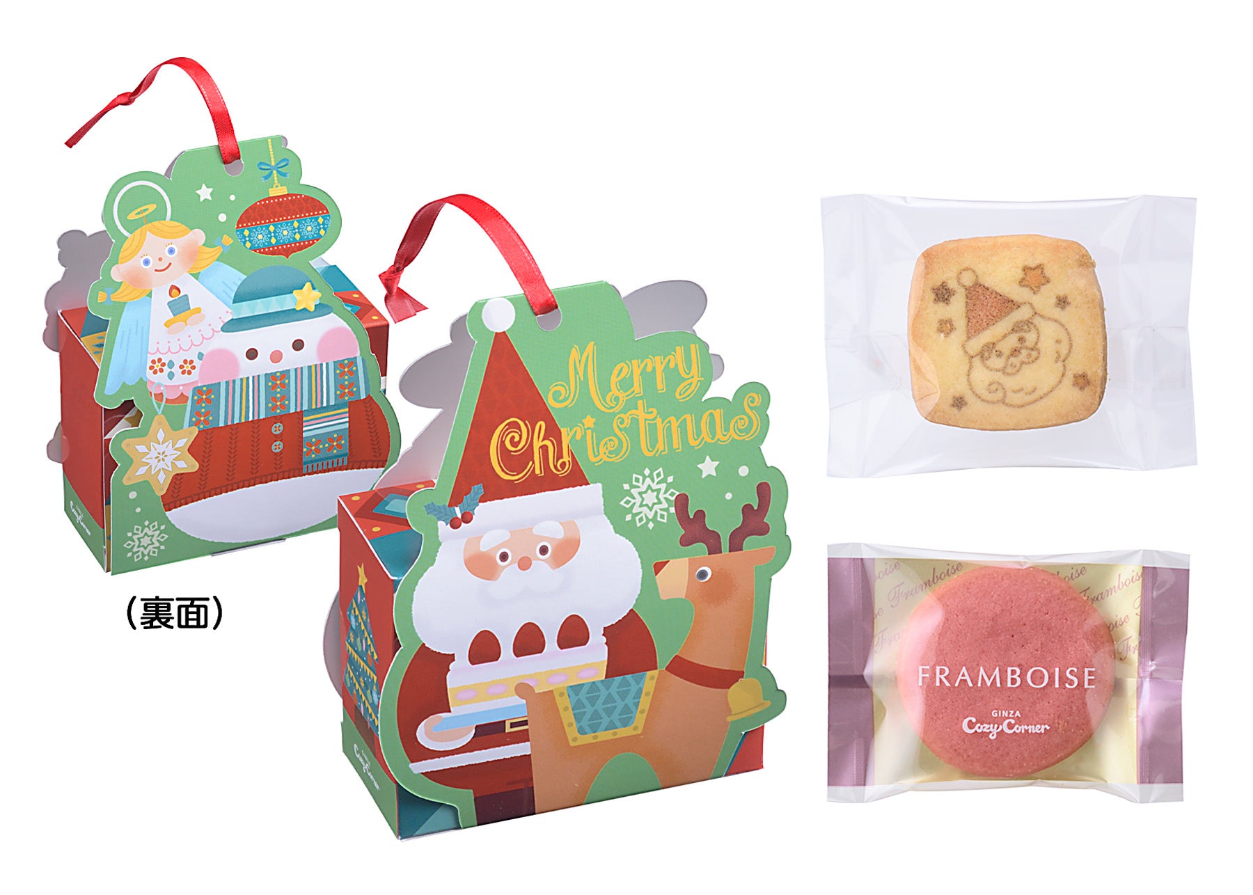 クリスマスといえばサンタクロース&トナカイ!オーナメント形BOXに、サンタクロース柄をプリントしたホワイトチョコのクッキーとフランボワーズのクッキーをアソート。BOXは表裏楽しめるデザインで、ひもが付いているのでツリーにつり下げて飾れるよ♪