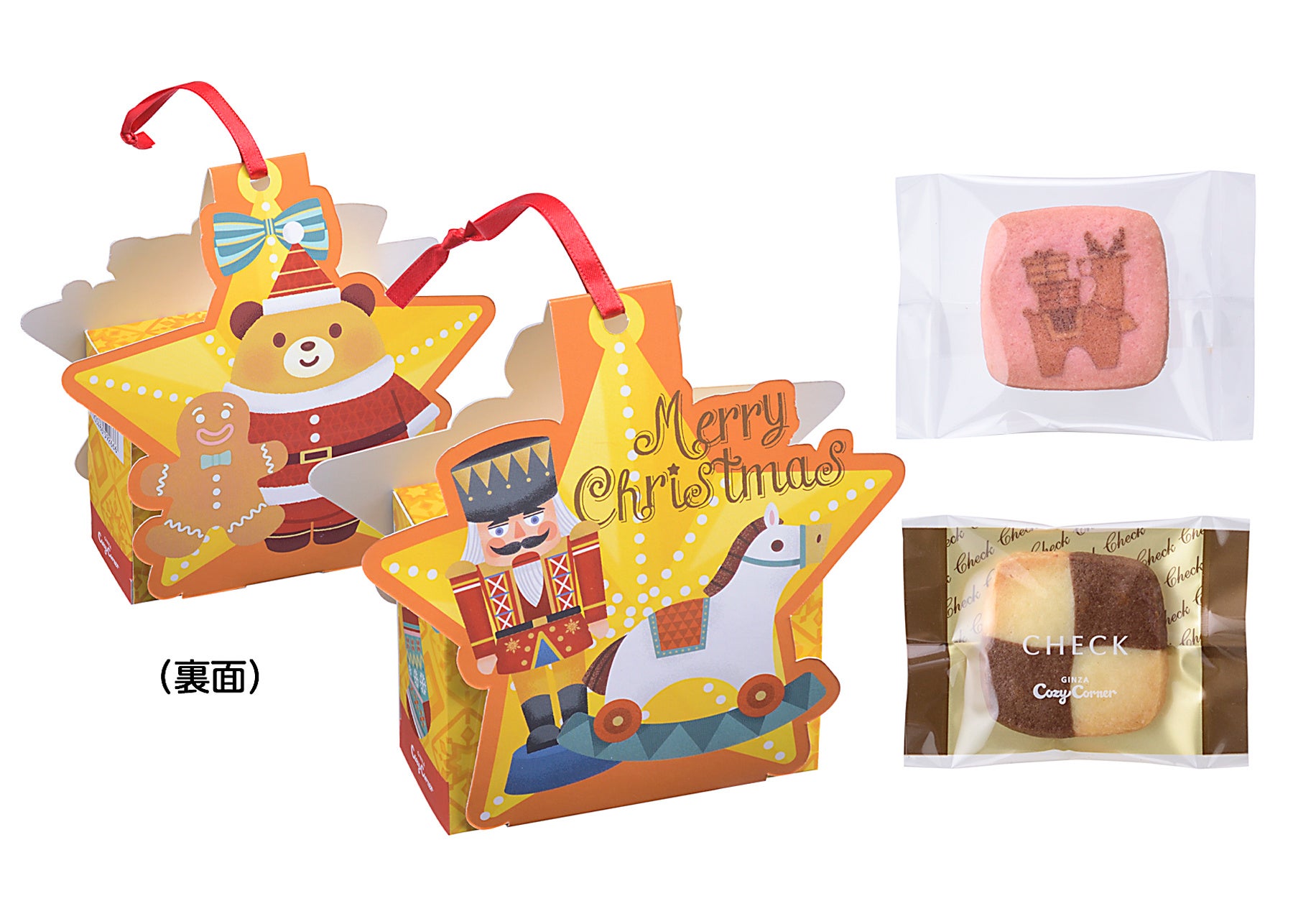 聖夜に輝くお星さまに、くまのサンタさんやジンジャーブレッドマン、おもちゃなどをデザインしたオーナメント形BOX。中には、トナカイ柄をプリントしたいちごクッキーとチェック柄のクッキーをアソート。ひもが付いているので、ツリーにつり下げて飾れるよ♪