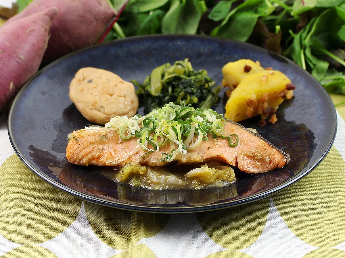 しっとりと焼き上げた鮭に、風味豊かなごまぽん酢だれをかけて仕上げました。淡口しょうゆをベースに味わい深い出汁とすりごま、ねりごま、いりごまを合わせております。酸味を抑えたまろやかなぽん酢と甘みのある白菜と共にお召し上がりください。