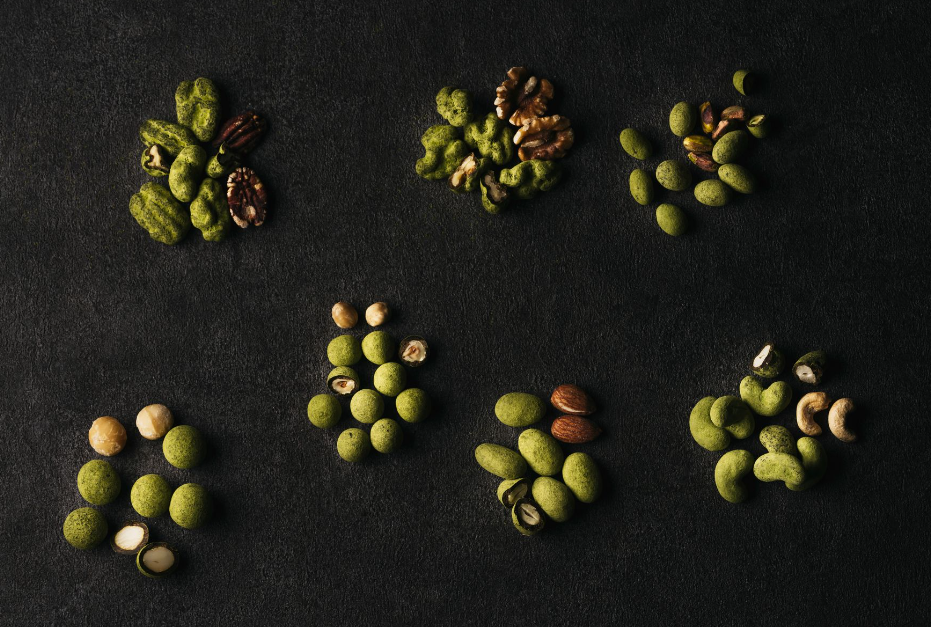 通常使用されるホワイトチョコレートは使わず、とろけるカカオ仕立て同様に低糖ダークチョコレートに宇治抹茶を贅沢・濃厚に練りこみ、さらに宇治抹茶をまぶしたことで、抹茶の苦味や深みをしっかりと感じることができます。さらに抹茶の苦味とカカオの苦味、ナッツの自然な甘みのバランスのとれた味わいになっています。また、美味しさはもちろんのこと、ナッツの栄養はそのままに低糖仕立て、緑茶カテキン含有と身体にも嬉しい、優しい商品に仕上げました。