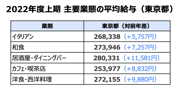 2022年に最も月給が上昇した業態は「居酒屋・ダイニングバー」となり、11,581円上昇。一方、上がり幅が少なかった業態は「イタリアン」で、5,757円上昇という結果になりました。