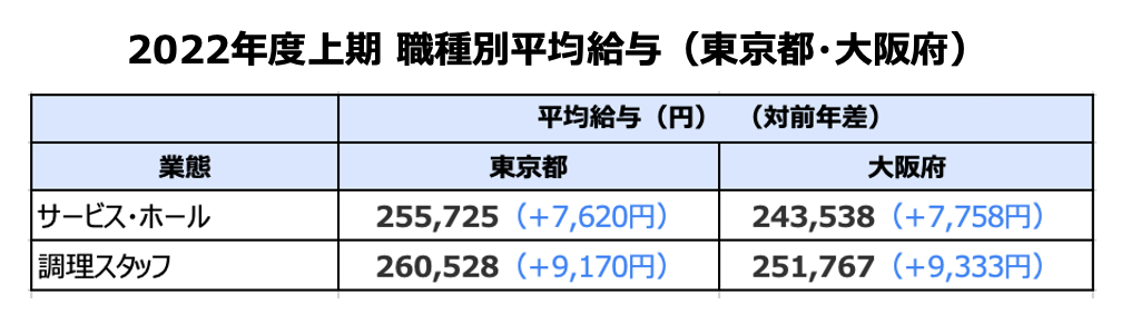 職種別給与額では、東京都・大阪府ともにサービス・ホールよりも調理スタッフの給与額が高い結果となりました。給与額の上がり幅は東京都・大阪府ともに調理スタッフのほうが高く、東京都は9,170円上昇、大阪府は9,333円上昇しました。