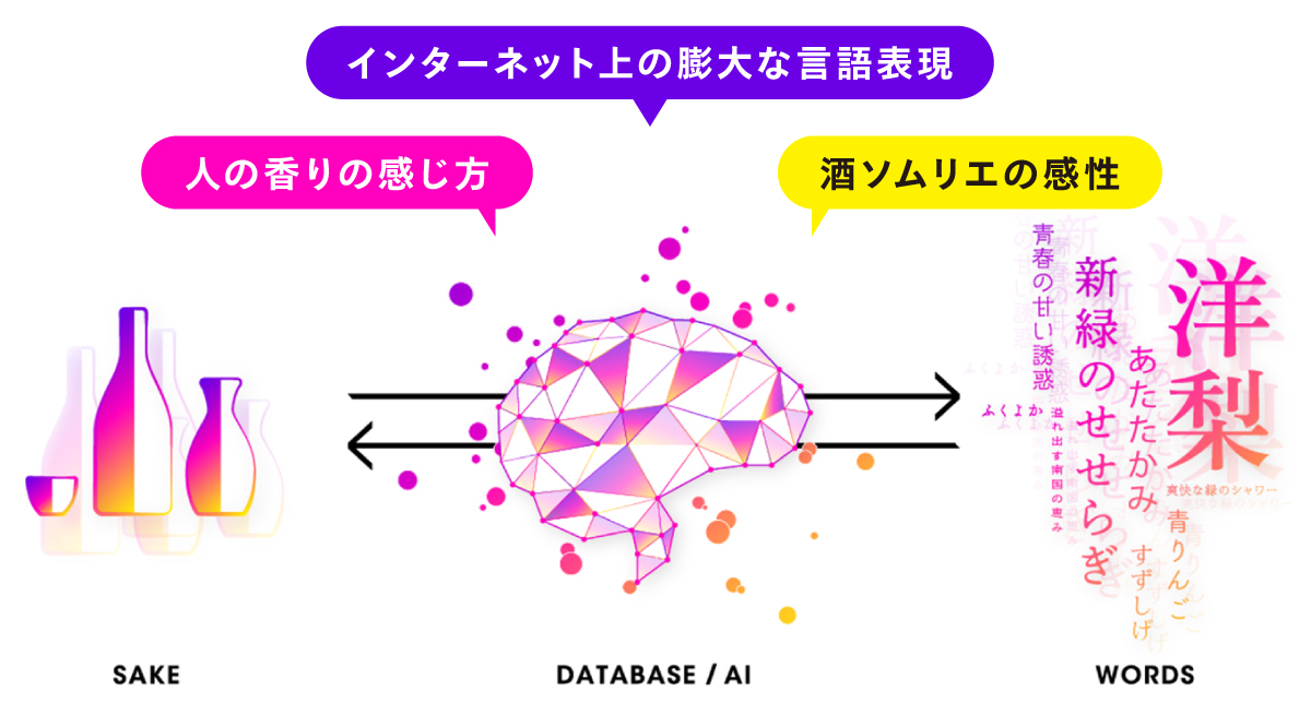 1万人以上の日本酒の風味・感性データを学習したAI がお酒の風味を表わす“言葉”の中から、感じた言葉を選択すると、AI があなたの感じ方を解析し、お酒とのマッチ度を計算し、おすすめのお酒をレコメンドします。